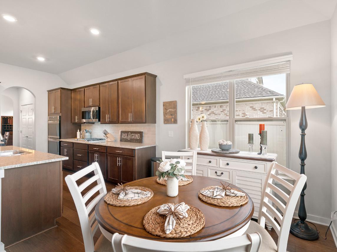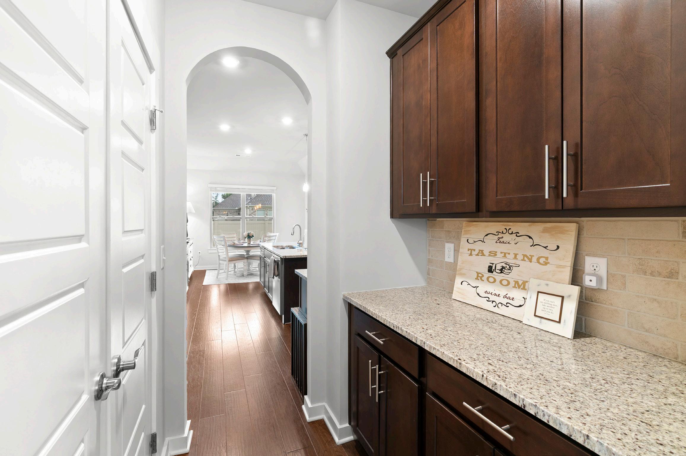 Connecting the dining room to the kitchen is a functional butler’s pantry, featuring the same stained cabinetry and matching granite countertop found in the kitchen. This convenient space is further enhanced by a double-door customized pantry, which includes a practical pull-out chrome bin and dedicated wine bottle storage.