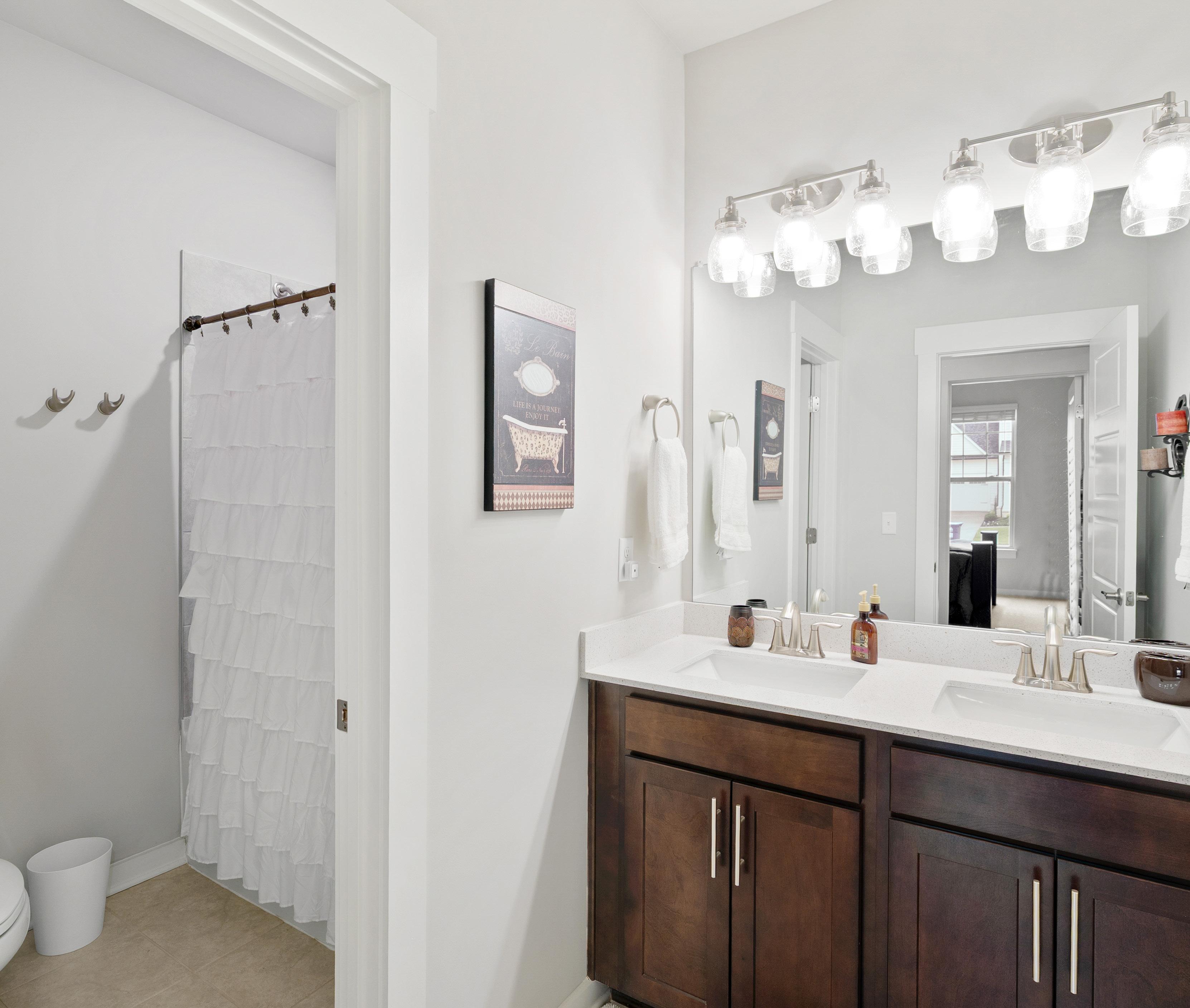 The hall bath is designed with both style and function in mind. It features a dualsink stained cabinet vanity with a granite countertop complemented by brushed chrome fixtures. The floor is covered in attractive tile, and the private tub/shower combo boasts a tasteful tile surround, brushed nickel faucets, and a practical corner shampoo ledge. For added convenience, a linen closet is situated in the hallway just outside this bathroom.