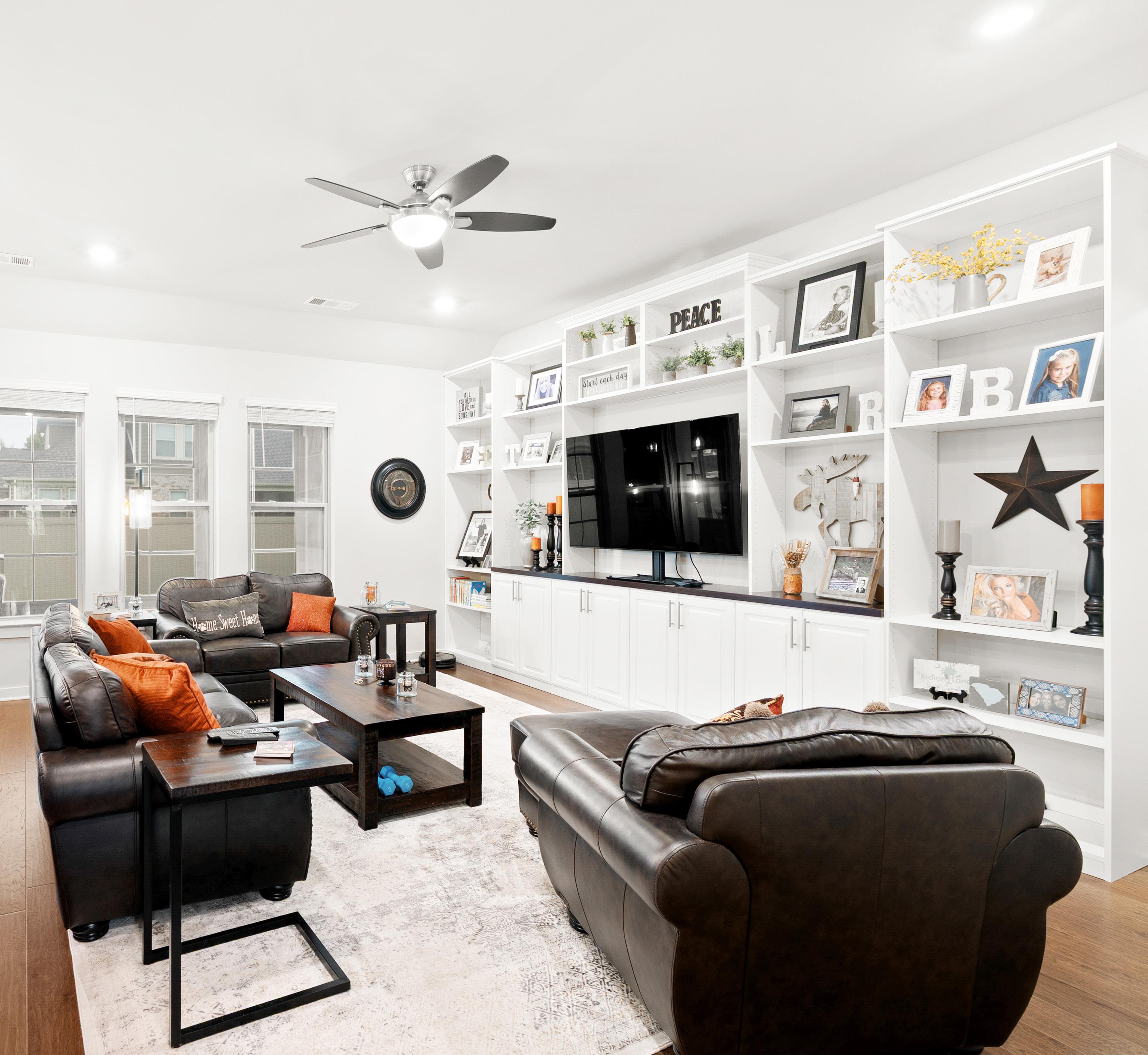 Additionally, several open shelving areas provide perfect spots to display decorative items, books, or cherished photographs. For year-round comfort, a ceiling fan is installed, ensuring pleasant air circulation throughout the space. Windows overlooking the porch and backyard bring in natural light, further enhancing the room’s appeal. This space truly combines comfort, style, and practicality for the whole family to enjoy.