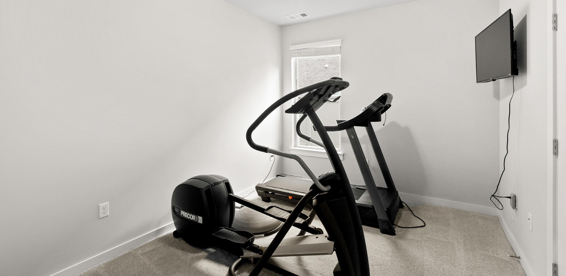 This flexible third bedroom is currently set up as an exercise room, showcasing its versatile potential. It features a window with blinds for adjustable light and privacy, and a TV mount is already in place for future TV and entertainment during workouts. The room is comfortably carpeted and includes a double-door closet for convenient storage.
