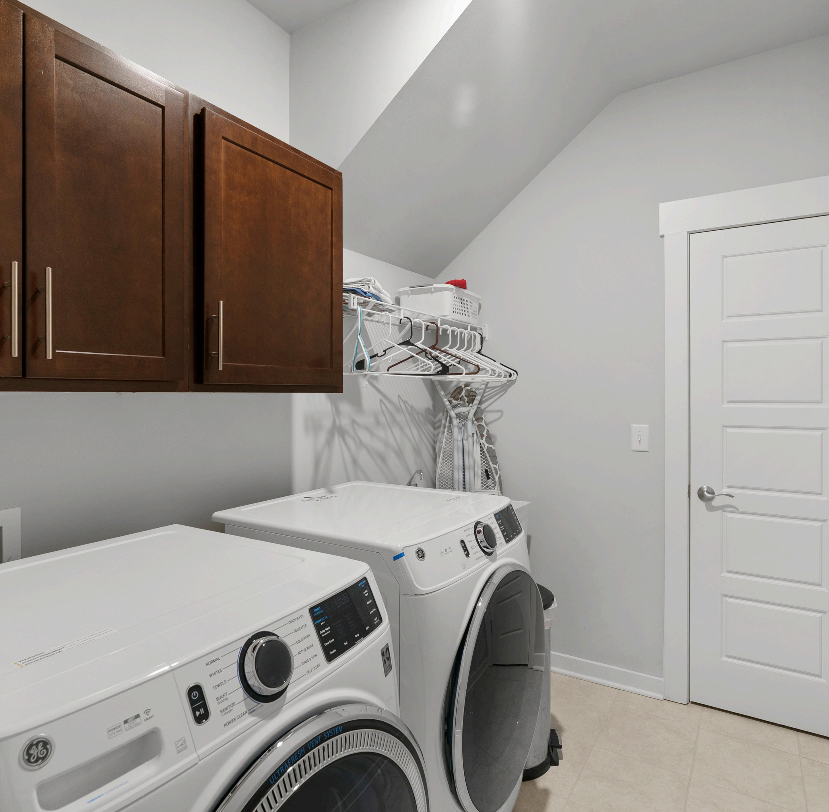 A convenient laundry room, designed for efficiency, includes durable tile floors, practical upper cabinets for storage, and a handy utility sink for soaking or quick clean-ups. A hanging rack provides a dedicated space for drying clothes, and a separate walk-in closet offers additional storage for laundry supplies or household items.