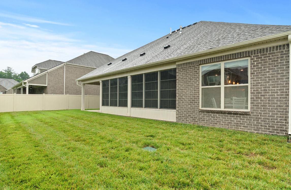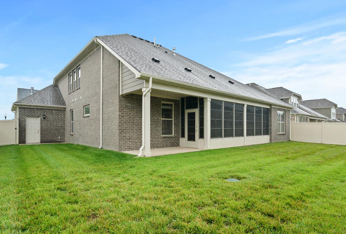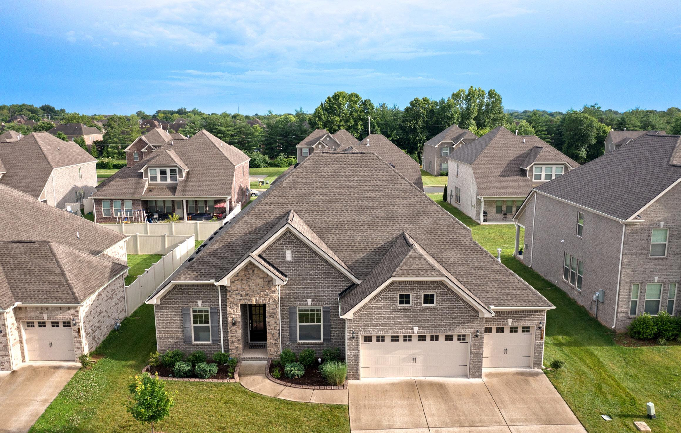This home boasts a beautiful stone and brick exterior, highlighted by stone paver edging that frames the front landscaping with style. A charming entry stoop features a distinctive shiplap-style trim ceiling, offering a warm welcome. Practical features include a three-car garage, a full yard irrigation system, a Ring camera, and a Schlage entry lock — all supported by a builtin security system for added peace of mind.