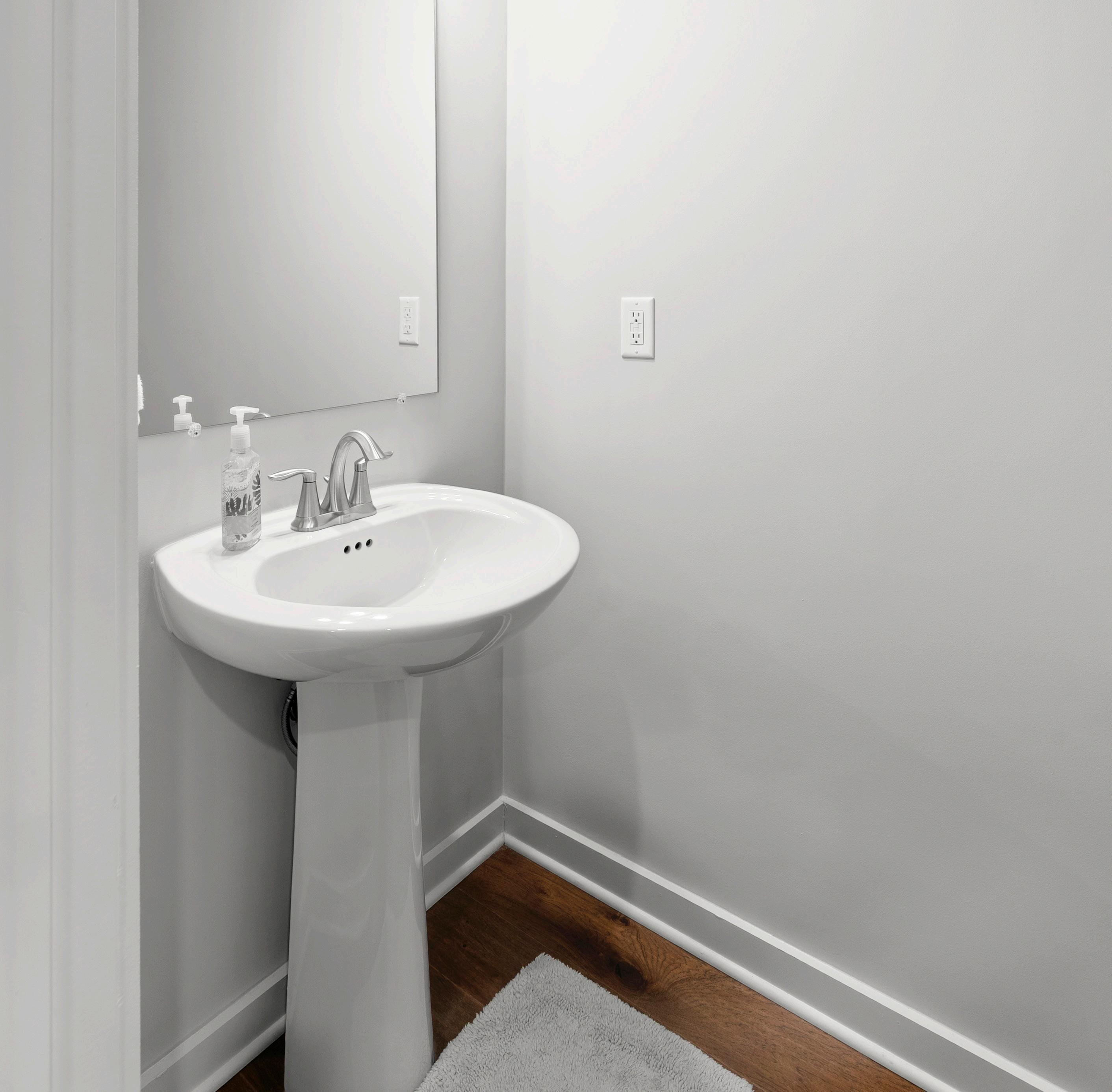 A convenient half bath is ideally situated near the family room, providing easy access for guests. This powder room features a classic pedestal sink, elegant hardwood floors, and stylish brushed nickel fixtures.