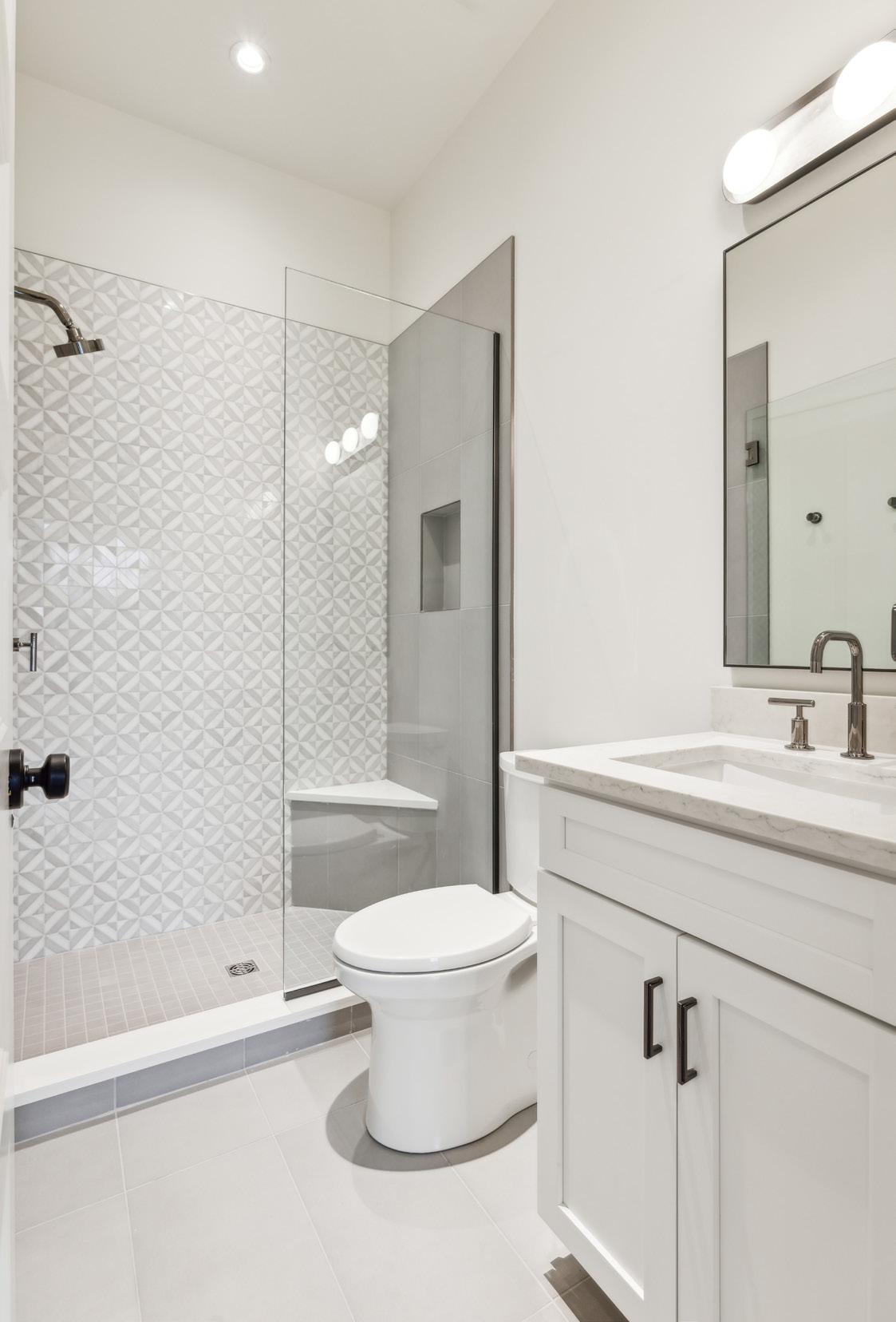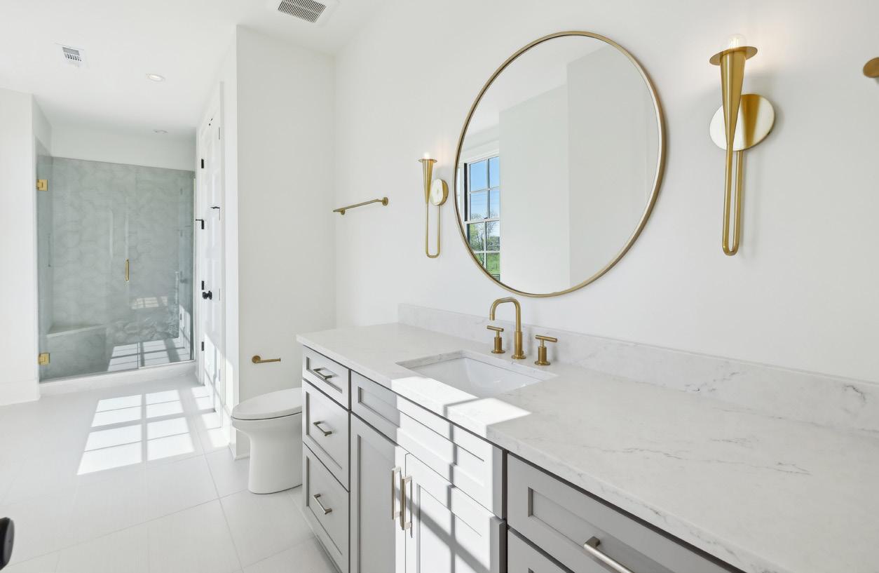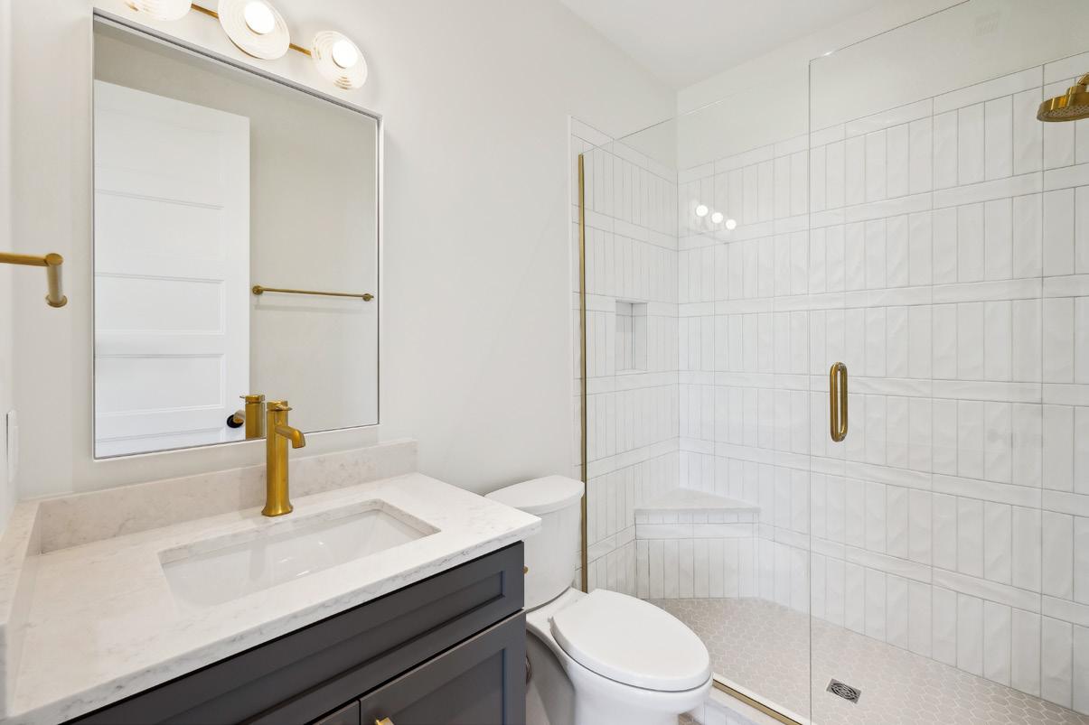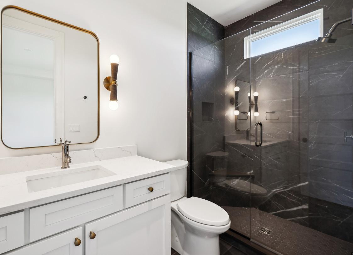 Bedroom #5 also mirrors the features of the previous bedrooms with a private bath and walk-in closet. Bathroom #5’s unique standouts include a white vanity with quartz counters contrasting beautifully with charcoal grey accents for the tile flooring, and shower surround.