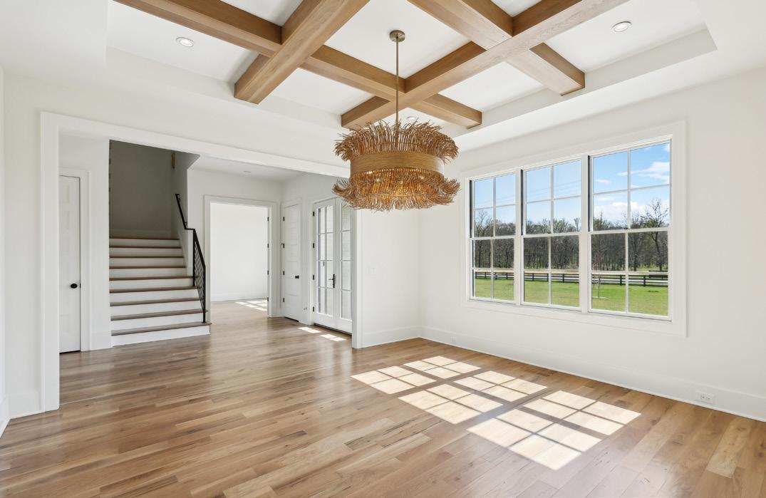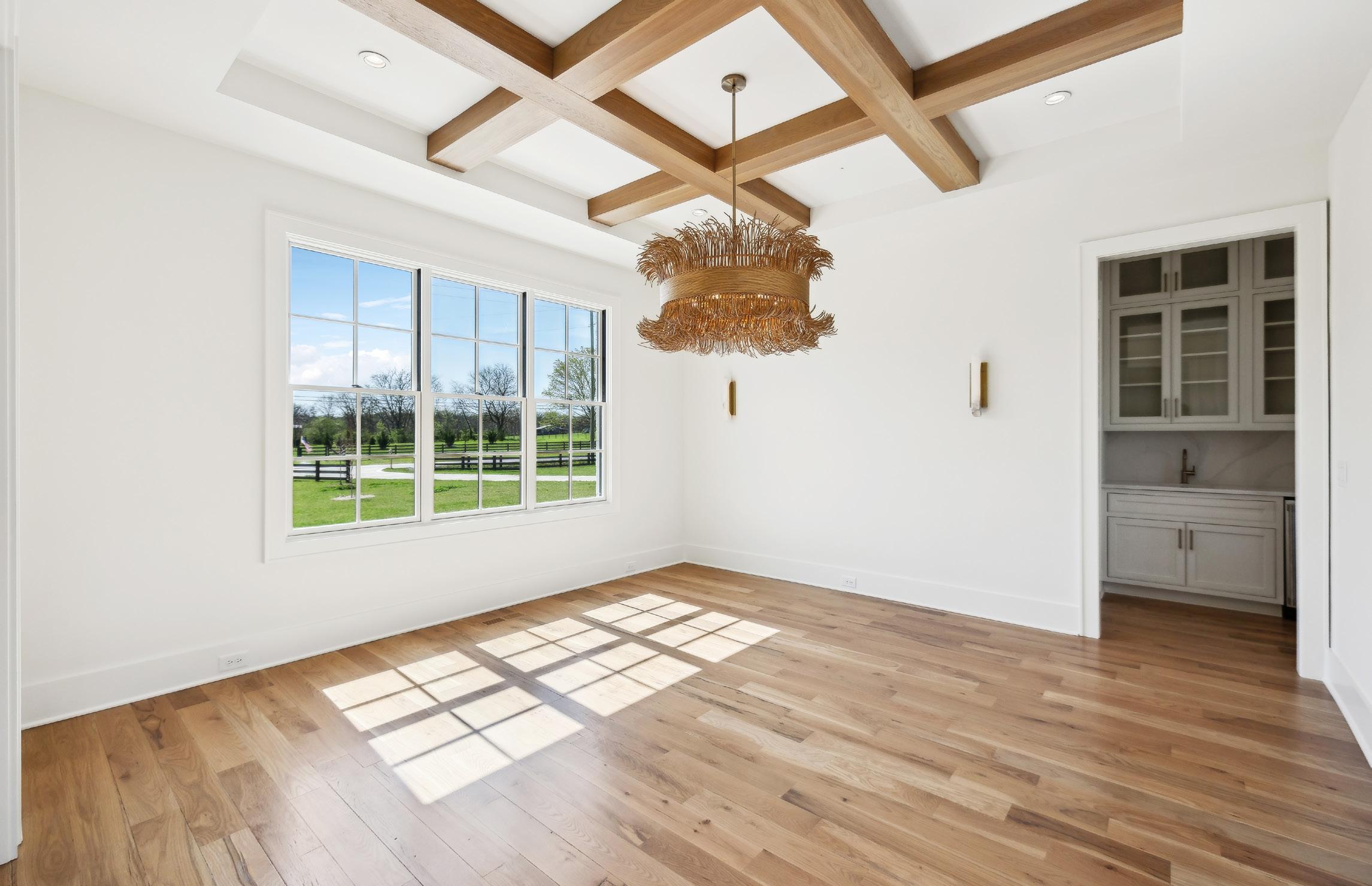 The spacious Dining Room, located just off of the Foyer, connects to the Kitchen through the Butler’s Pantry. Notable features include a stained coffered beam ceiling design with can lighting and a stylish chandelier. The Butlery offers under cabinet lighting, sink, wine/beer fridge, quartz countertops, upper cabinets with glass fronts, and a preparation area with open air shelving.