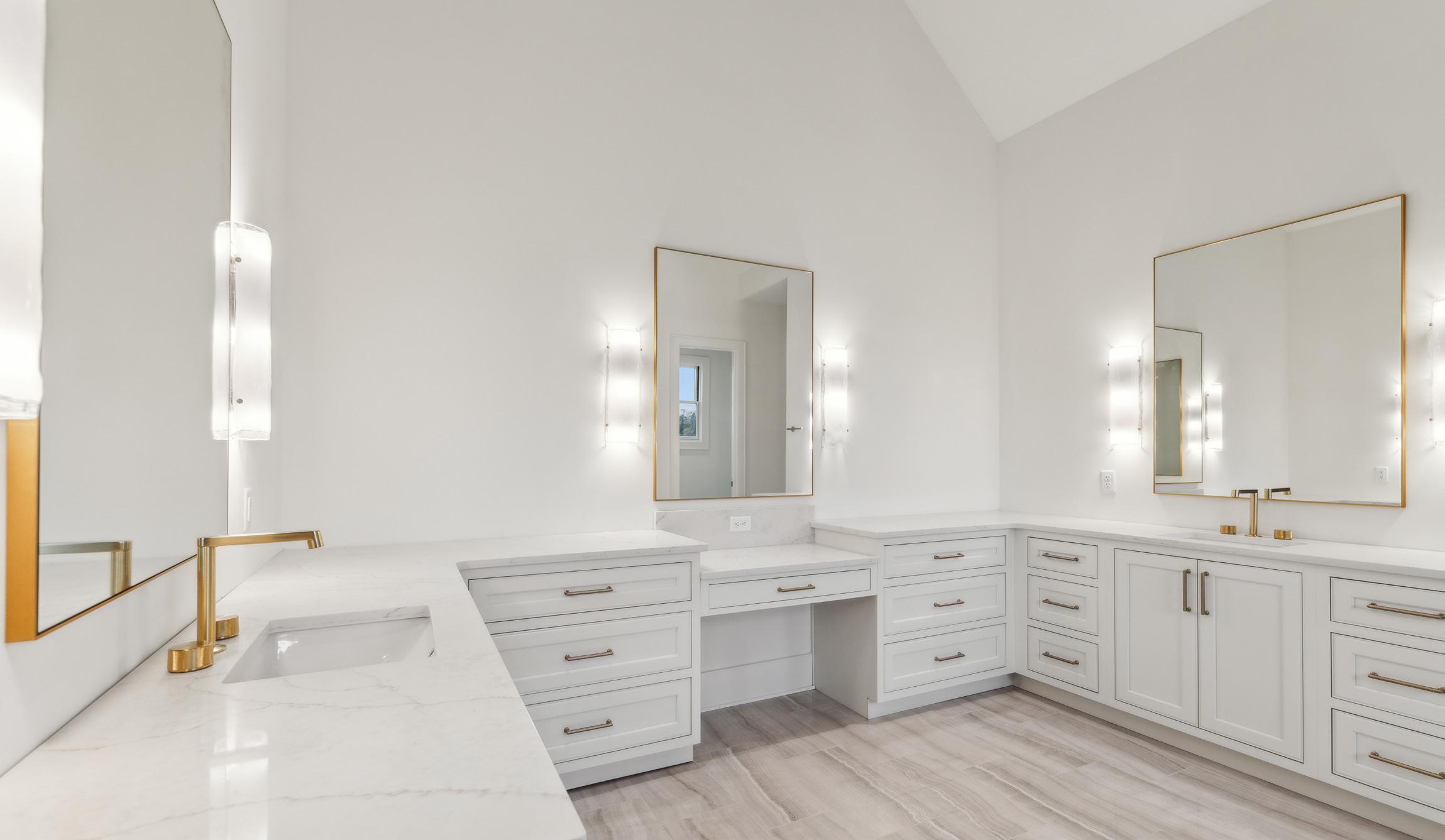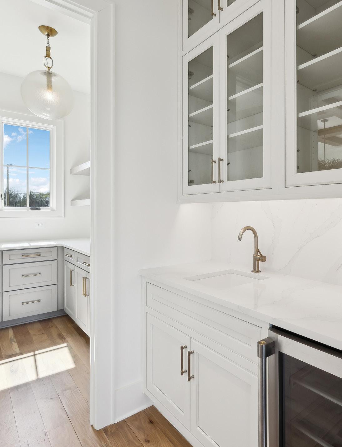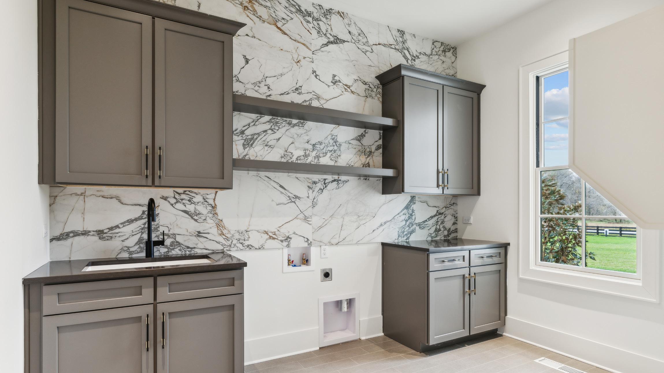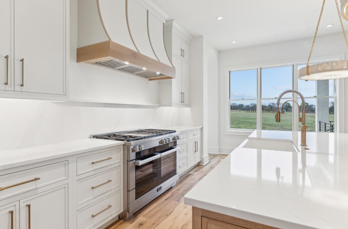 Experience luxury and functionality in this well designed kitchen. This Kitchen’s open floor plan provides open views into the Family Room and out to the Covered Porch. With features such as quartz countertops and backsplash, satin brass handles on the cabinetry, luxe gold faucet, an expansive center island with extra storage, and stainless steel appliances, this Kitchen will be sure to inspire all of your culinary endeavors.