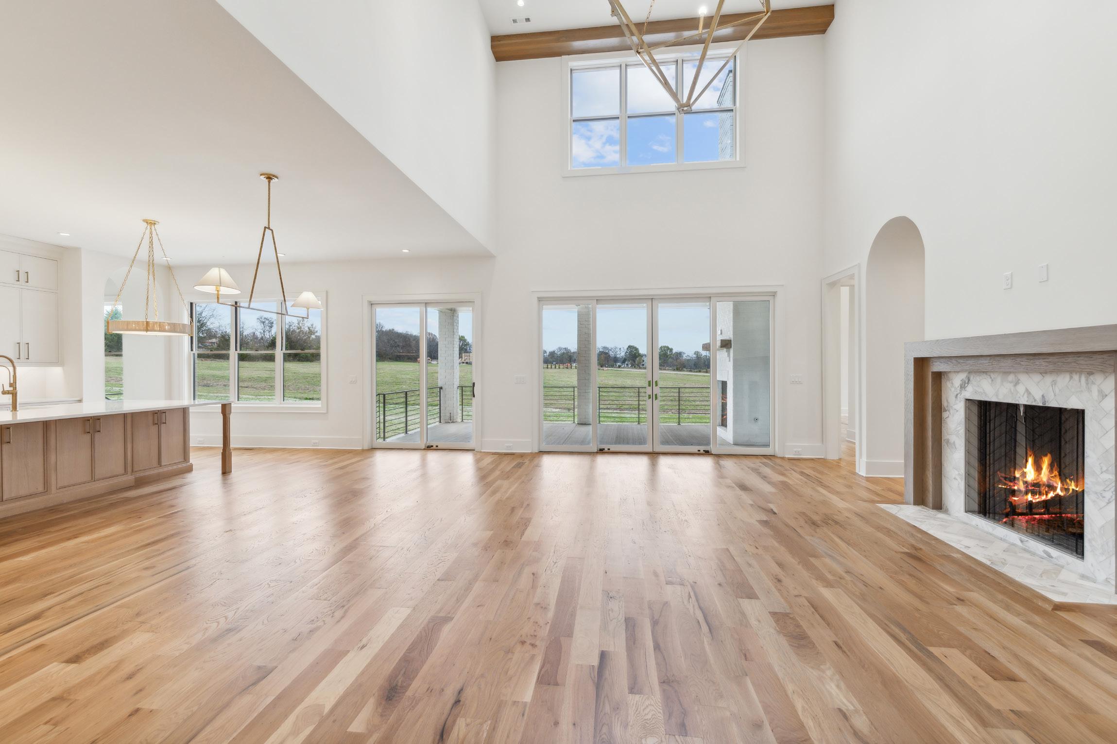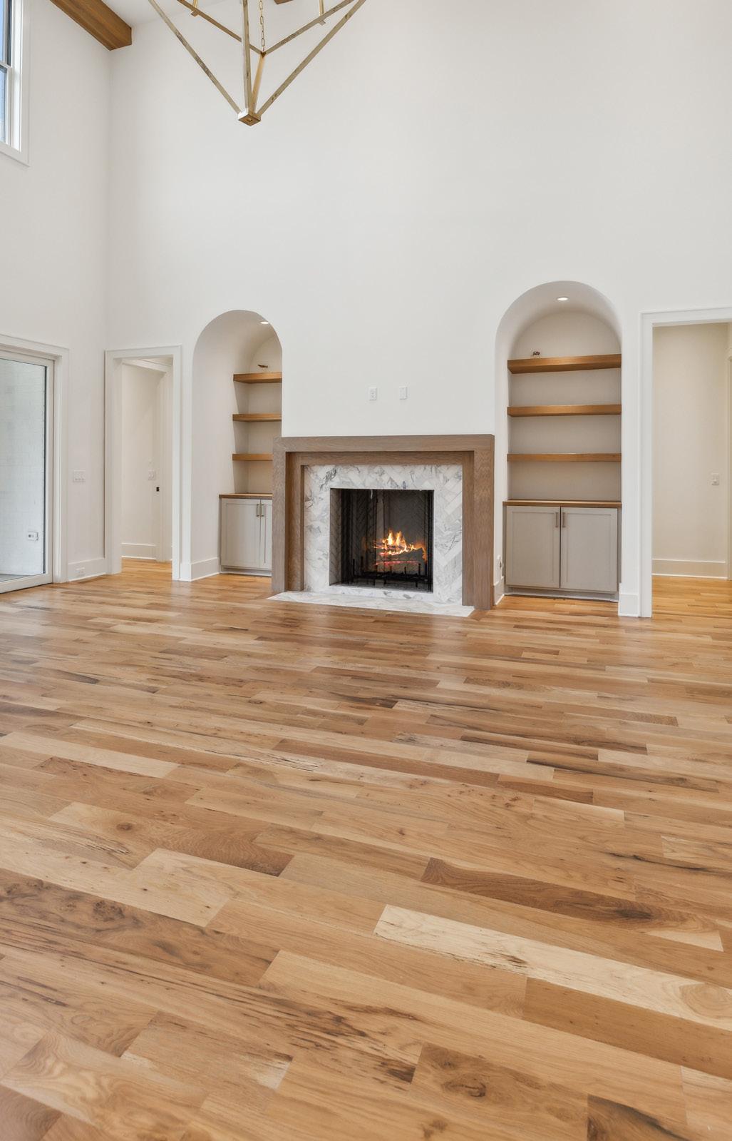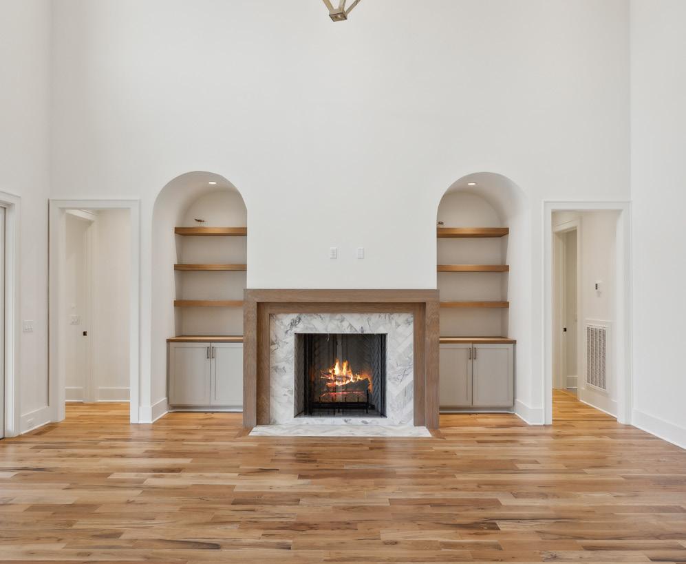 The spacious Family Room is the center piece of the home. Open to the Kitchen, this room provides a great flow for entertaining and is highlighted by a marble fireplace flanked by built-ins with open shelves above. Additional components include high ceilings with beams and modern chandelier, access to the Covered Porch, and hardwood flooring.