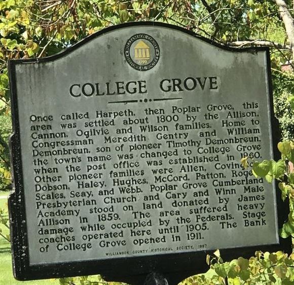 College Grove includes several landmark buildings listed on the National Register of historic places including the Williamson Allison House, Bank of College Grove, Botstick Female Academy, College Grove Methodist Church, and Parks Place.