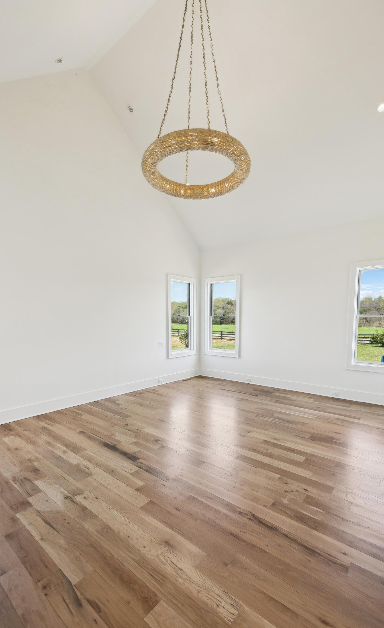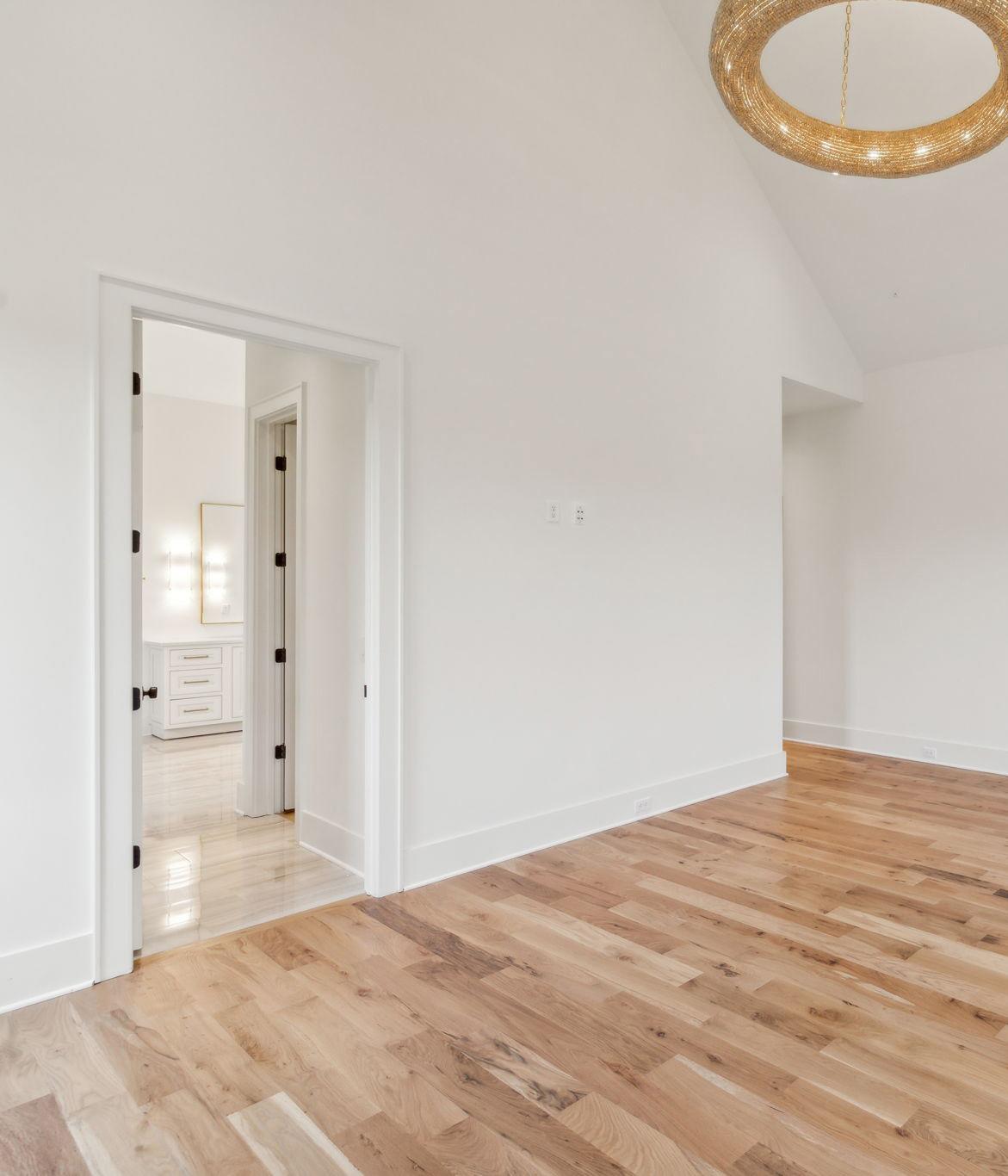 The voluminous Primary Bedroom is a soothing retreat after a long day. Located on the Main Level, this space offers hardwood flooring, vaulted ceiling and a glamorous circular chandelier.