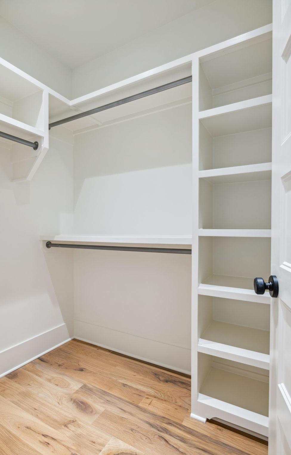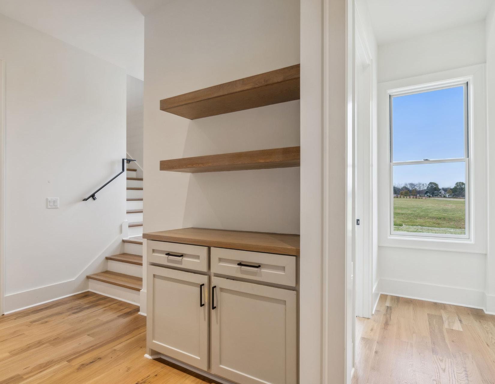 Conveniently located off the garage, this home features a functional Mud Room tailored for busy lifestyles. This space is comprised of hardwood floors, cubbies, a coat closet, storage cabinets, and open shelves perfect for a drop zone, outdoor gear, shoes, and everyday essentials. Stay organized and keep clutter at bay with this wellappointed space.