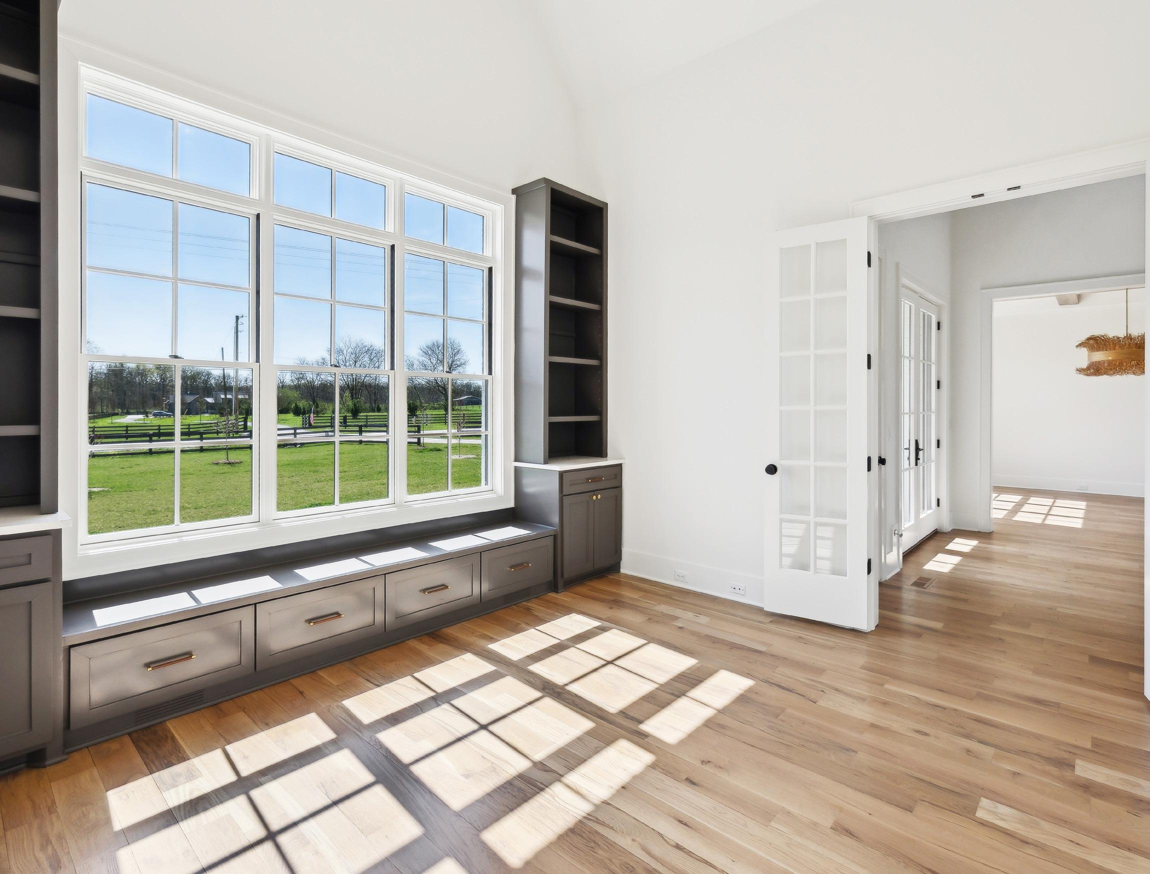 The Study is located just off of the Foyer through a set of beautiful french doors and features built-in painted shelves, cabinets, and drawers. A window seat and large windows with transoms create an airy feel to the space.