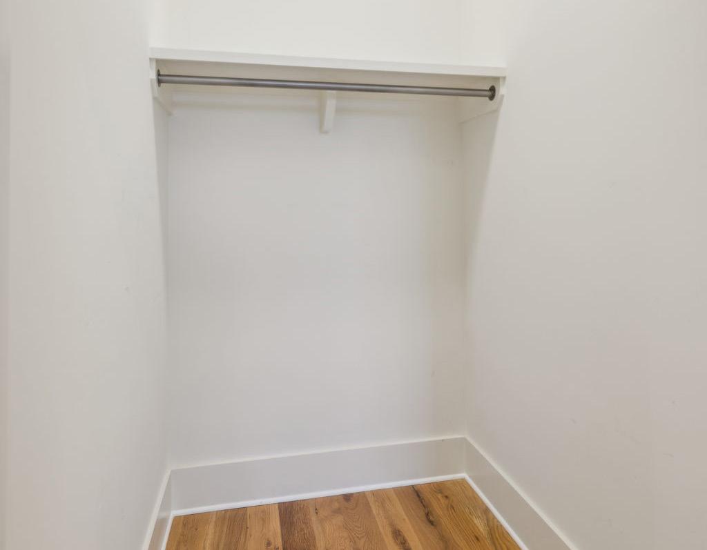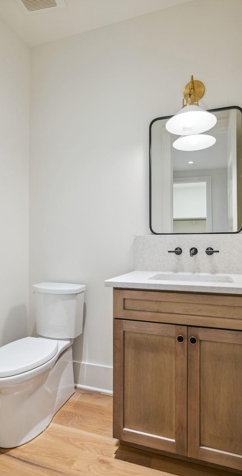 The Powder Rooms are located on both levels of the house. The Main Level comes with a stylish tile floor, quartz topped vanity, and brass finishes. The Upper Level Powder room features hardwood flooring and quartz counter tops, and sleek, matte black finishes.