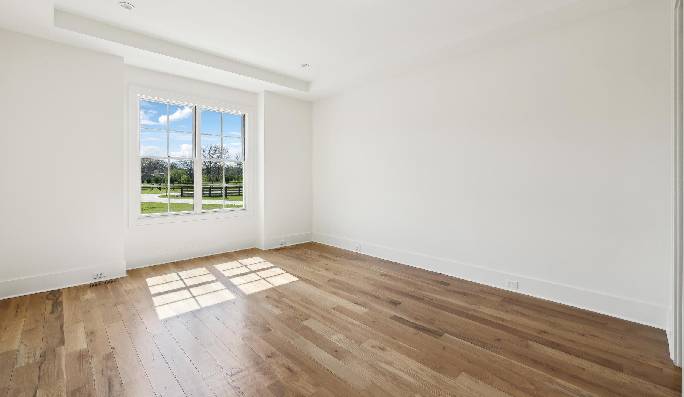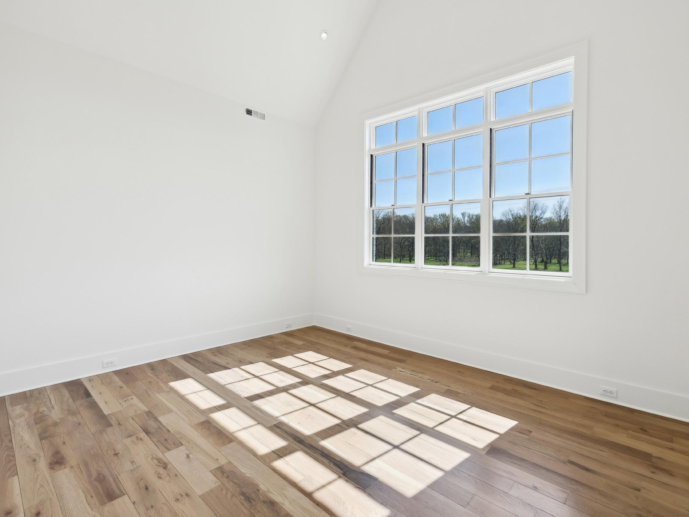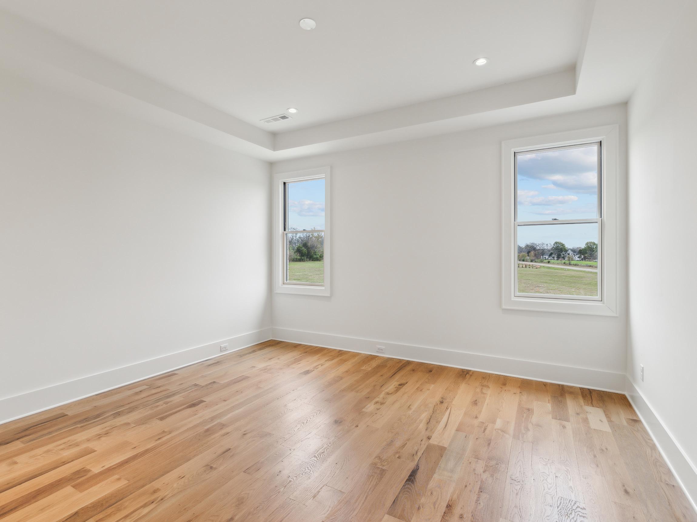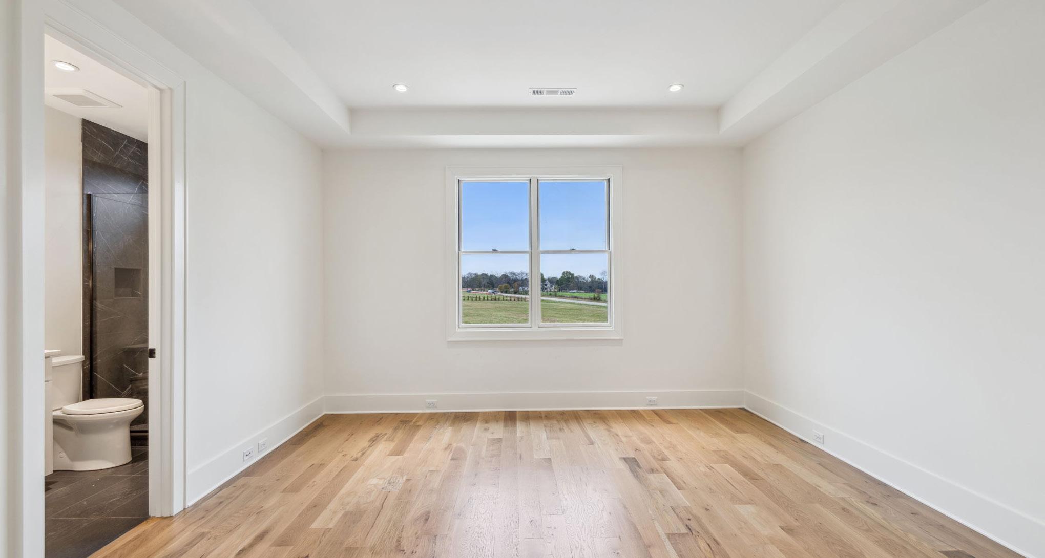 The upper level third bedroom boasts captivating views of the surrounding country side and is appointed similarly to Bedroom #2 with hardwood floors and a trey ceiling with can lighting. The Ensuite Bath provides a clean slate for any decor with a grey vanity with quartz counters, gold fixtures, and a walk-in shower with a frameless glass door.