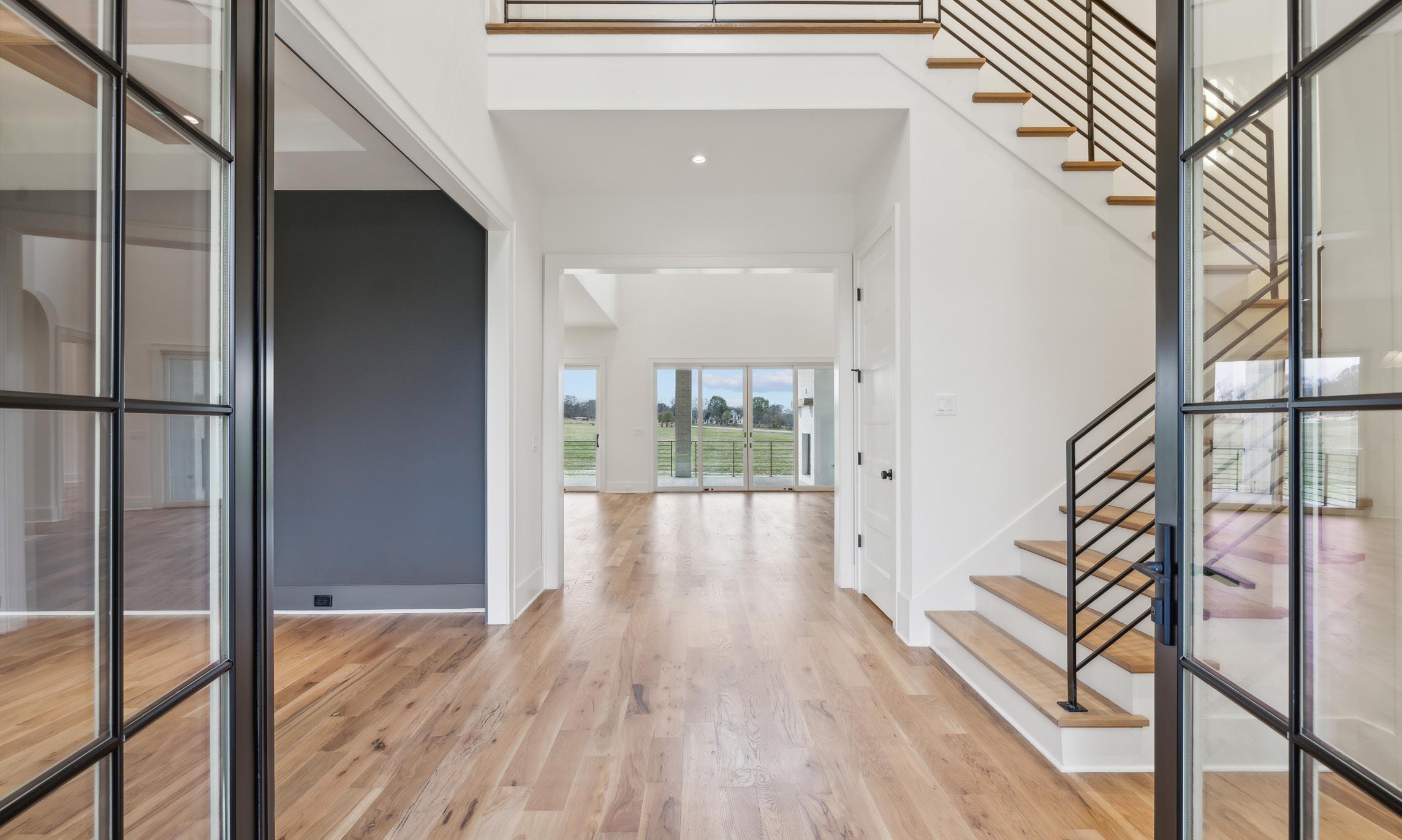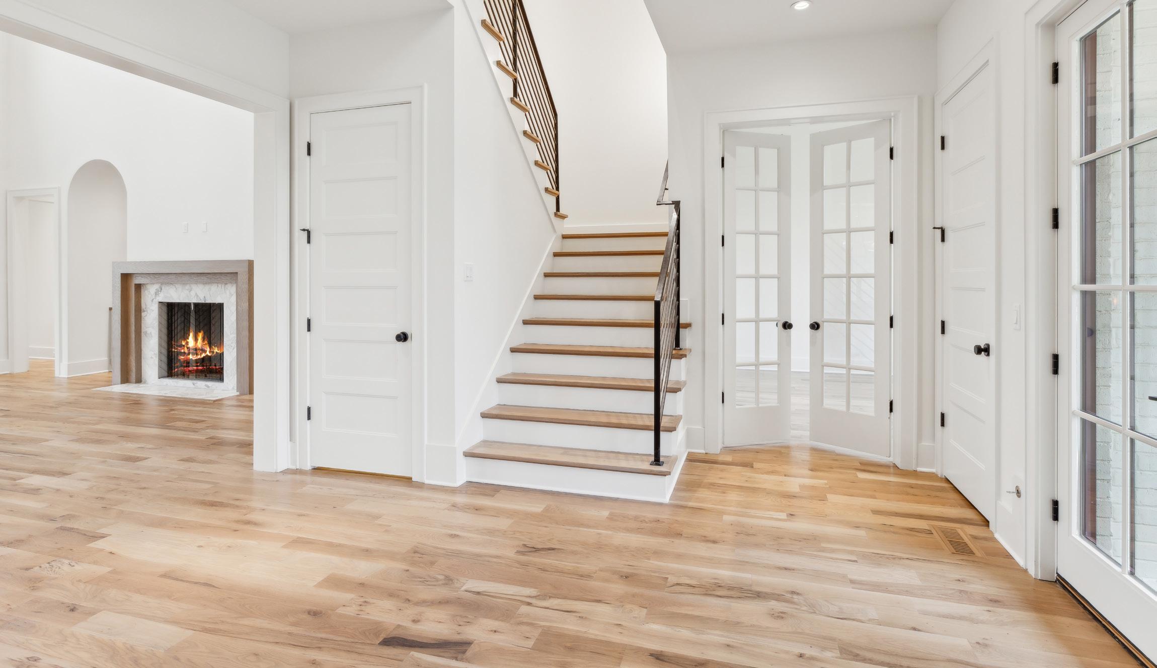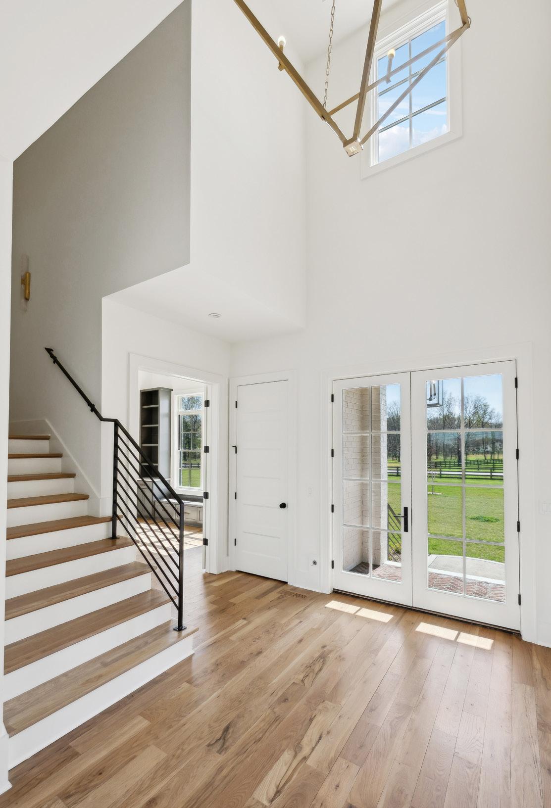 The 2-story Foyer leaves a lasting first impression. As you pass through the glass double door entrance, you are welcomed by stunning hardwood floors, high ceilings, and a chic modern chandelier. Features also include a coat closet under the stairs and a window above the door for supplementary light.
