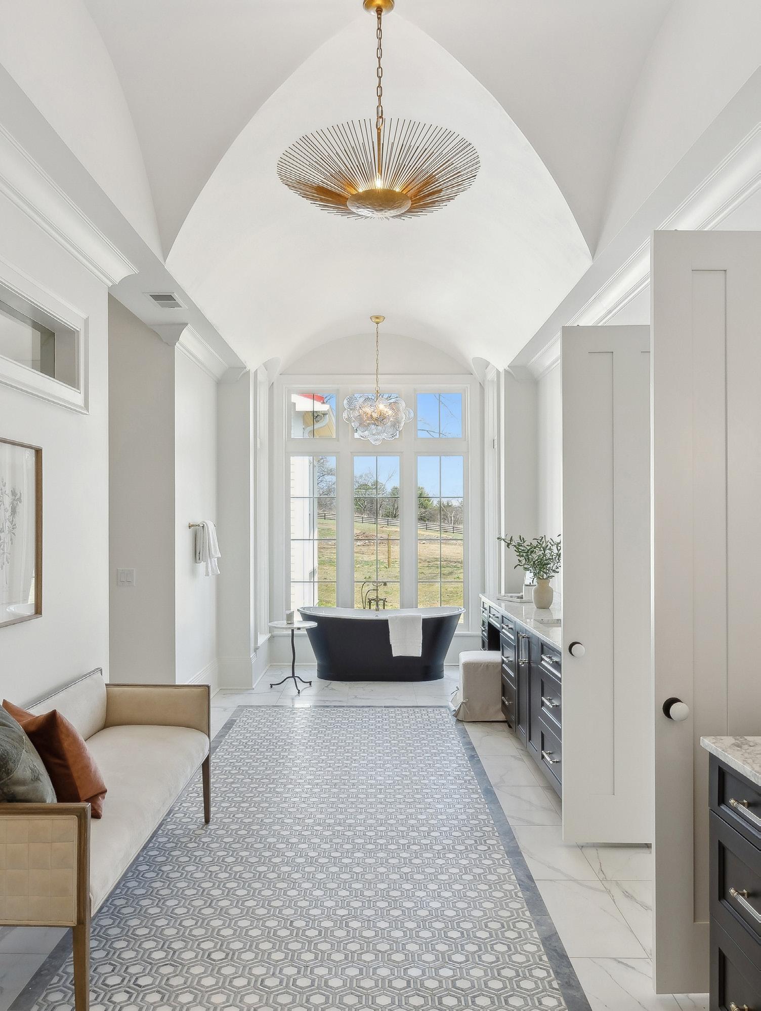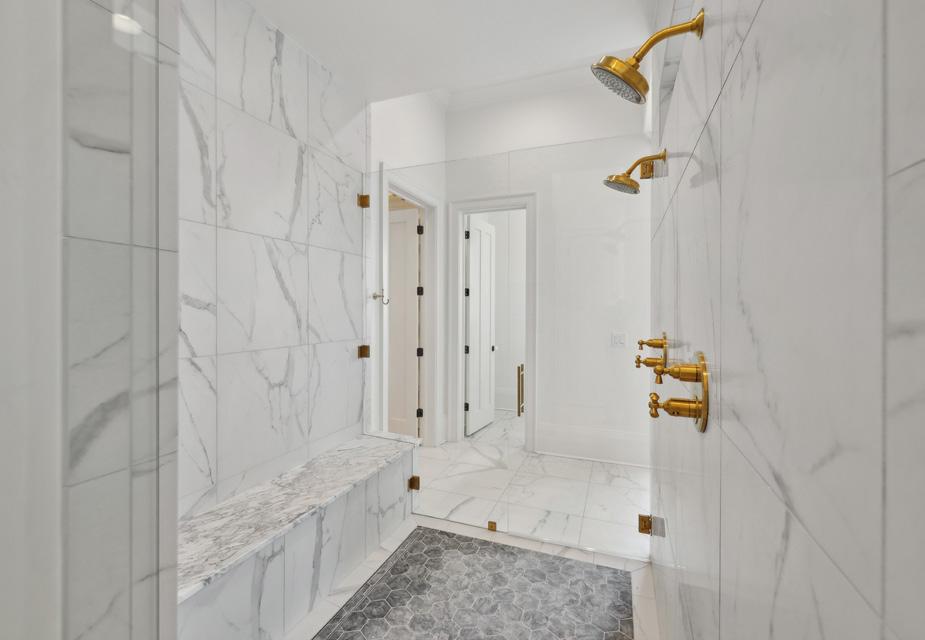 The Primary Bathroom is nothing short of a spa-like oasis, designed to help you wash away the stresses of the day. The groin vaulted ceiling, large vanities with Carrara marble countertops, and gold fixtures make a bold statement, while the heated tile flooring with hexagonal accents adds to the sophisticated charm. Indulge in the oversized walk-in shower, complete with a full-length bench seat, dual shower heads, handheld, and dual-entry frameless glass doors. Alternatively, relax in the freestanding tub, framed by a large window that floods the space with natural light. Every detail of this suite, from the luxurious wet bar to the tranquil bathroom, creates a perfect haven for relaxation and rejuvenation.