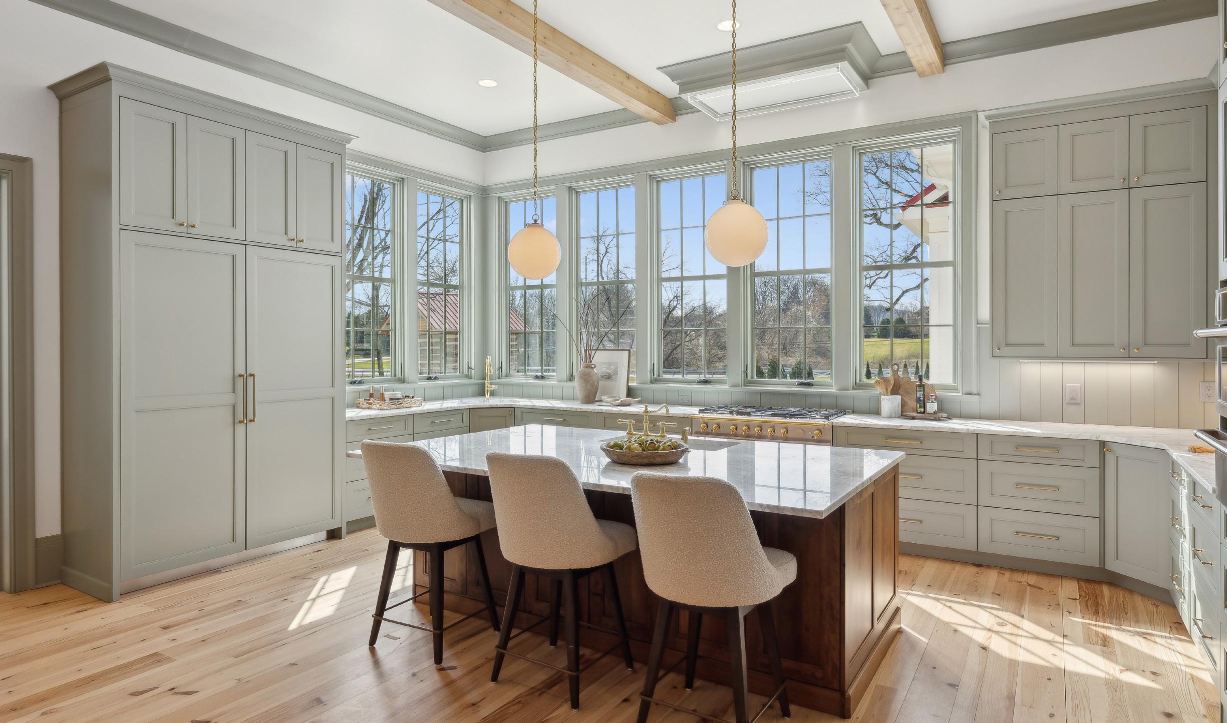 This beautiful kitchen, with plenty of natural light, is the true heart of the home—a space where both style and function effortlessly come together. Modern touches, such as painted cabinetry, a striking stained wood island, and sleek Carrara marble countertops, set the tone, while a vertical shiplap backsplash, adds warmth and character. Thoughtful details, like under-cabinet lighting, crown molding atop soaring ceilings, wood beams, and a corner sink framed by casement windows, create an inviting atmosphere. The walk-in pantry, with custom wood shelving, adds practicality to this culinary haven. Exquisite, high-end appliances—including a 43” five-burner Dual Fuel La Cornue stainless range with brass accents, a 48” ceiling-mounted vent hood with a remote control, a 60” Monogram refrigerator and freezer with front panels and an internal water/ice maker, an Asko panel-ready dishwasher, 30” double wall ovens, a 30” stainless Monogram warming drawer, and a 30” Advant microwave—make this kitchen a chef’s dream. Opening to the breakfast area and family room, it’s the perfect space to entertain loved ones, share meals, and create cherished memories that will last a lifetime.