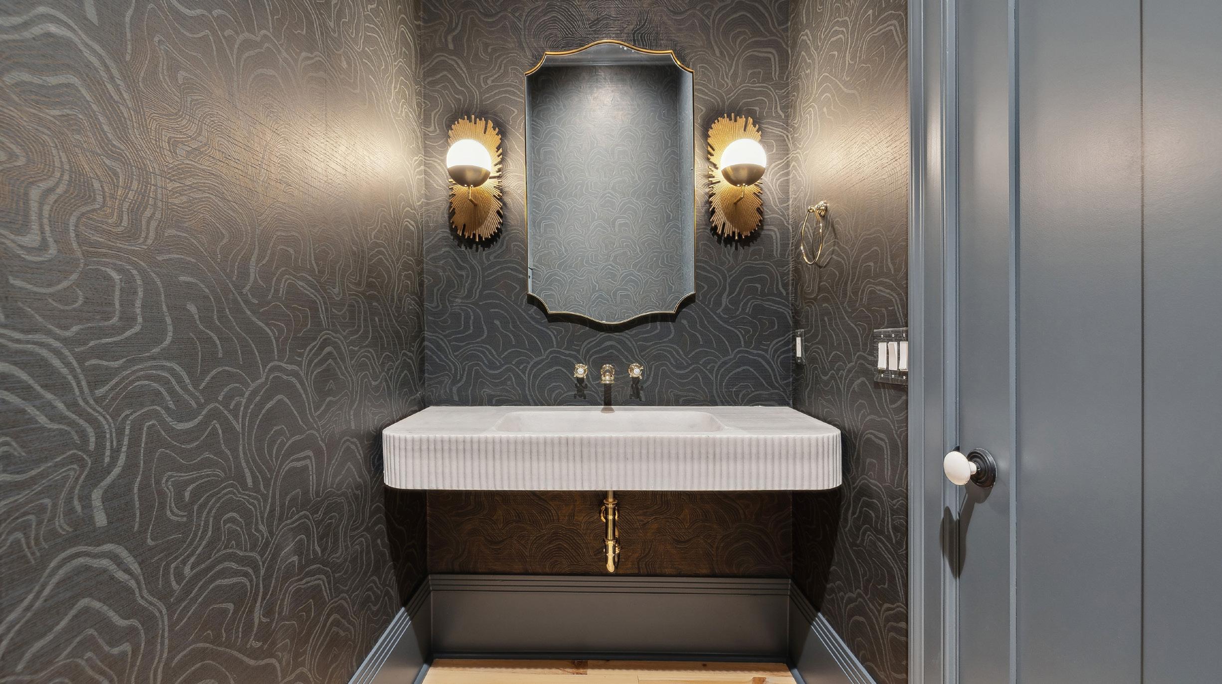 The home features three stylish powder rooms, each thoughtfully designed for convenience and elegance. On the main level, both powder rooms feature gorgeous custom-made floating marble sinks from Europe. The larger, main powder room provides a double-door storage cabinet with a fun, hidden storage area behind. The upstairs powder room, conveniently located off the bonus room, boasts a chic-feathered metal light fixture and a classic pedestal sink.