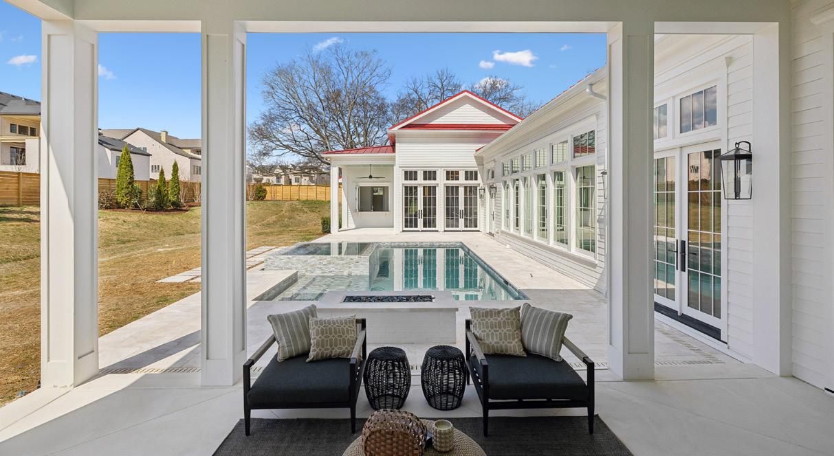 Beyond the double doors, the Main Level Club Room unfolds like a dream—a breathtaking fusion of modern convenience and timeless elegance, designed for both entertaining and moments of relaxation. A soaring ceiling, adorned with a single, striking beam, enhances the room’s sense of openness, while two sets of double glass French doors invite the sunlight, seamlessly connecting the indoors with the shimmering pool and spa just beyond. Another glass French door and window lead to a third covered porch, extending the flow of this magnificent retreat. At its heart, a stately fireplace showcasing Niveo Volterra Casa Di Sassi stone and a wood mantle salvaged from the original smokehouse anchors the room, a warm and inviting focal point and includes wiring for immersive 5.1 surround sound, creating a rich and dynamic audio experience—perfect for cozy movie nights or lively gatherings.