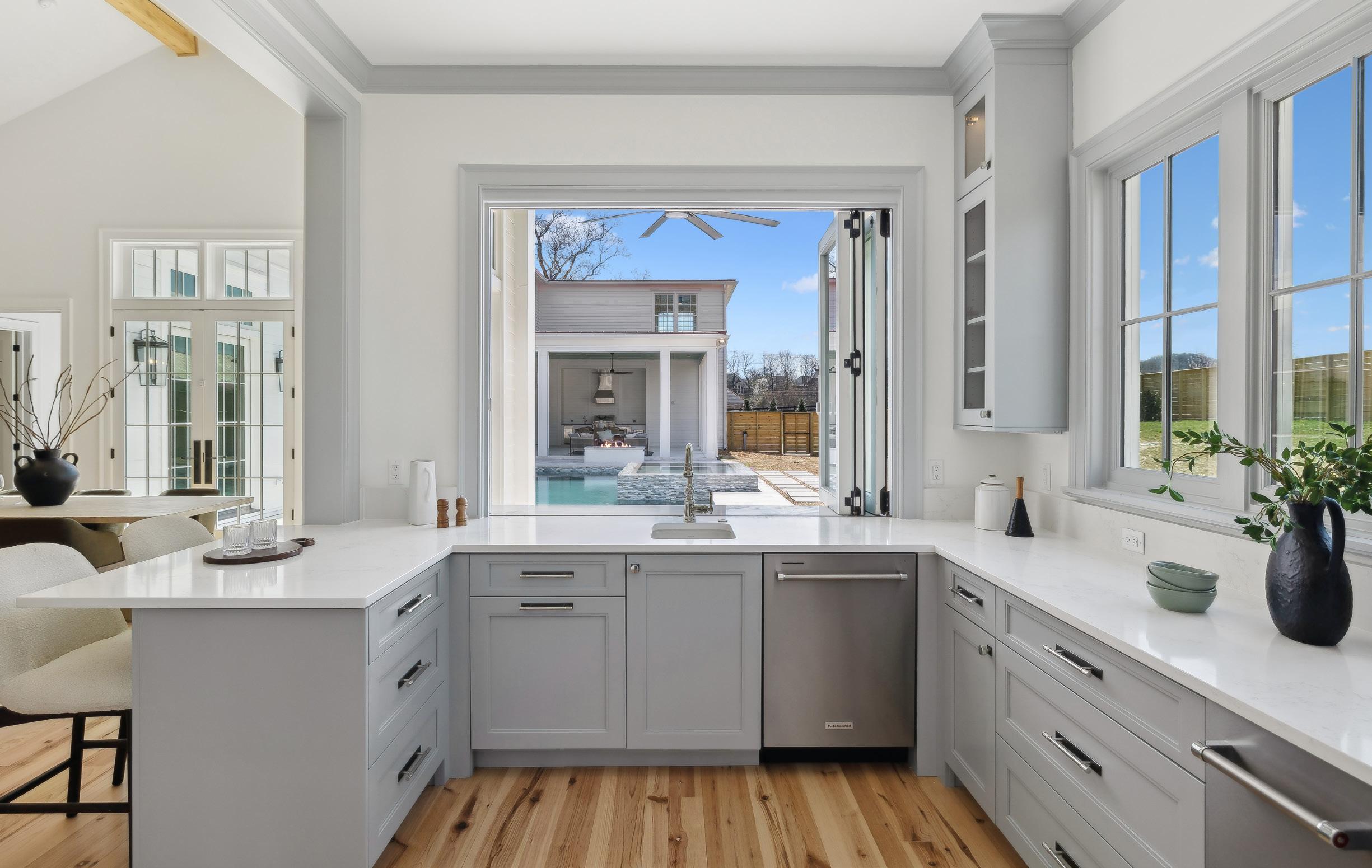 The fully-equipped bar is a masterpiece of both form and function, where painted cabinets with glass doors showcase fine craftsmanship, soft-close drawers add a touch of luxury, and quartz countertops gleam beneath the glow of under-cabinet lighting. The antiquestyle chrome faucet lends a hint of vintage charm, while the casement window serves as a delightful pass-through for effortless outdoor dining. An Avallon beverage fridge, Kitchenaid ice maker, and Kitchenaid dishwasher complete this entertainer’s paradise, ensuring every gathering is as seamless as it is memorable.