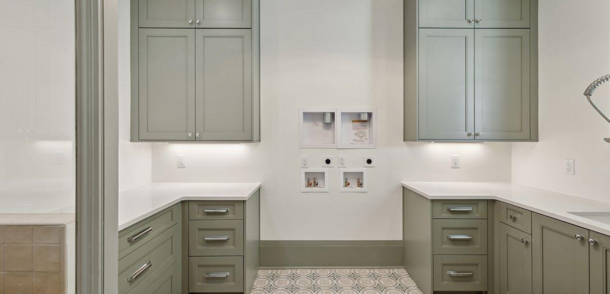 This charming laundry room allows for the convenience of two sets of washers and dryers, features stylish sage green cabinetry, and a trendy patterned tile floor. It’s as functional as it is beautiful, with a convenient sink, a dedicated dog wash, and plenty of counter space. Tackling chores has never been easier!