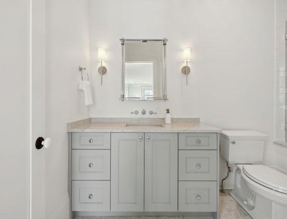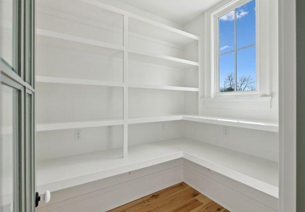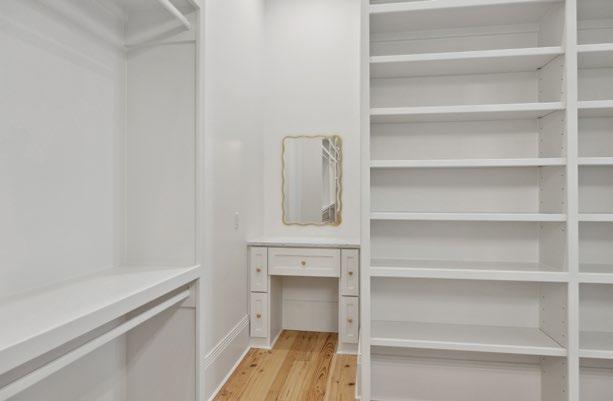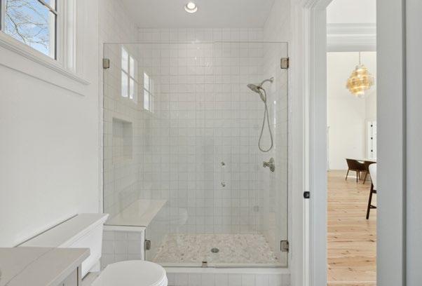 In keeping with the home’s other bedrooms, Bedroom 4 features a sleek circular light fixture and double windows that provide a lovely view of the side yard as well as a private ensuite Bath. The heart pine hardwood flooring adds warmth and character, while the spacious walk-in closet boasts custom trim carpenter shelving. The ensuite bath is thoughtfully designed with a walkin shower, complete with a mosaic marble tile floor, tile surround, and a built-in niche for added convenience. A stained wood vanity with a quartz countertop adds a touch of sophistication to this beautifully appointed space.