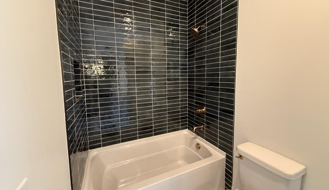 The hall bath echoes the home’s sophisticated design with its gray inset cabinetry and polished quartz countertops creating a seamless tone-on-tone effect while antique gold faucets and sconce lighting delicately frame the mirror. The 12x24 tile flooring enhances the sense of luxury and scale, leading to a thoughtfully designed separate wet area that allows multiple users to enjoy the space simultaneously. The tub and shower combination is adorned with exquisite glossy textured tile extending to the ceiling, complemented by a convenient shampoo niche for both beauty and function. A generous linen closet, paired with the vanity, provides ample storage.