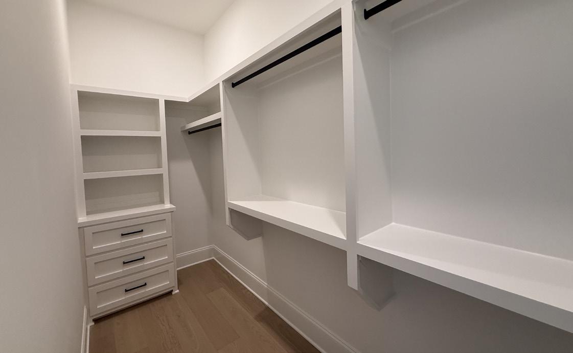 • Walk-in closet with custom wood shelving, drawers & bench + W/D hookup