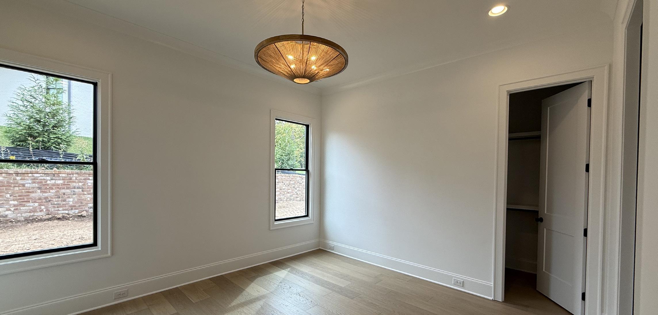 One of three elegant secondary bedrooms on the upper level, this inviting space combines comfort and craftsmanship in perfect harmony. Recessed lighting and a ceiling fan provide a warm, balanced ambiance, while crown molding adds an architectural touch. Soft, plush carpeting underfoot enhances the room’s sense of luxury, complemented by two well-placed windows that fill the space with natural light. Thoughtful details continue with convenient attic access and a spacious walk-in closet featuring custom wood shelving and built-in drawers that provide ample storage.