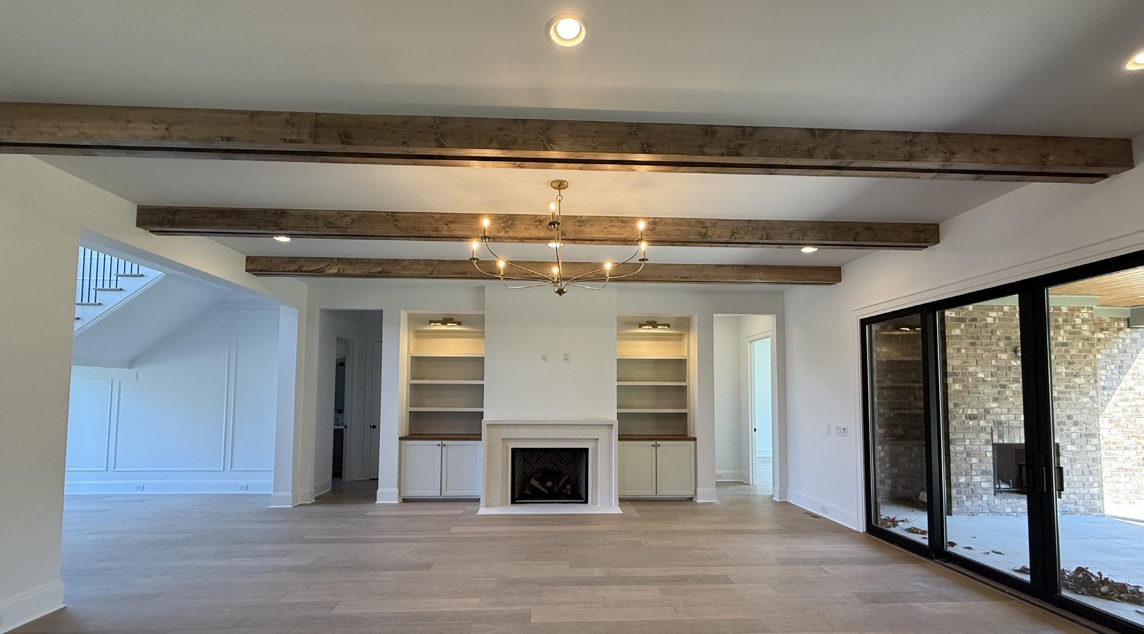 The Family Room is a large yet inviting space, anchored by a striking ArcusStone fireplace, flanked by built-in bookcases that offer both elegance and functional storage. Wood beam detailing on the ceiling adds warmth and character enhancing the cozy environment. A full wall of floor to ceiling windows, complemented by a sliding glass door leading to the expansive covered porch, fills the room with abundant light and creates a seamless connection to the outdoors. This sophisticated space is ideal for relaxing with family, entertaining guests, or enjoying quiet moments by the fire, perfectly blending comfort and luxury.