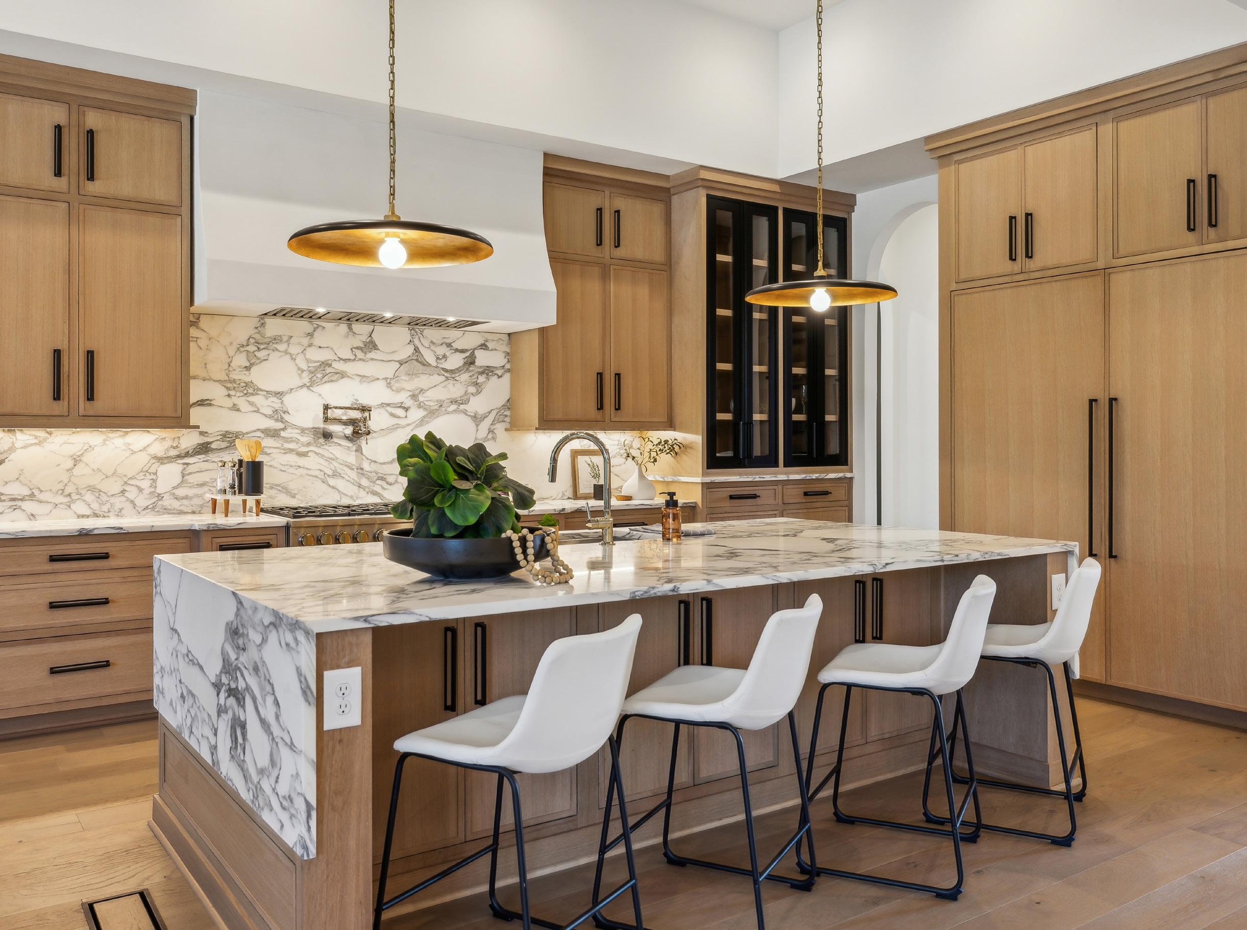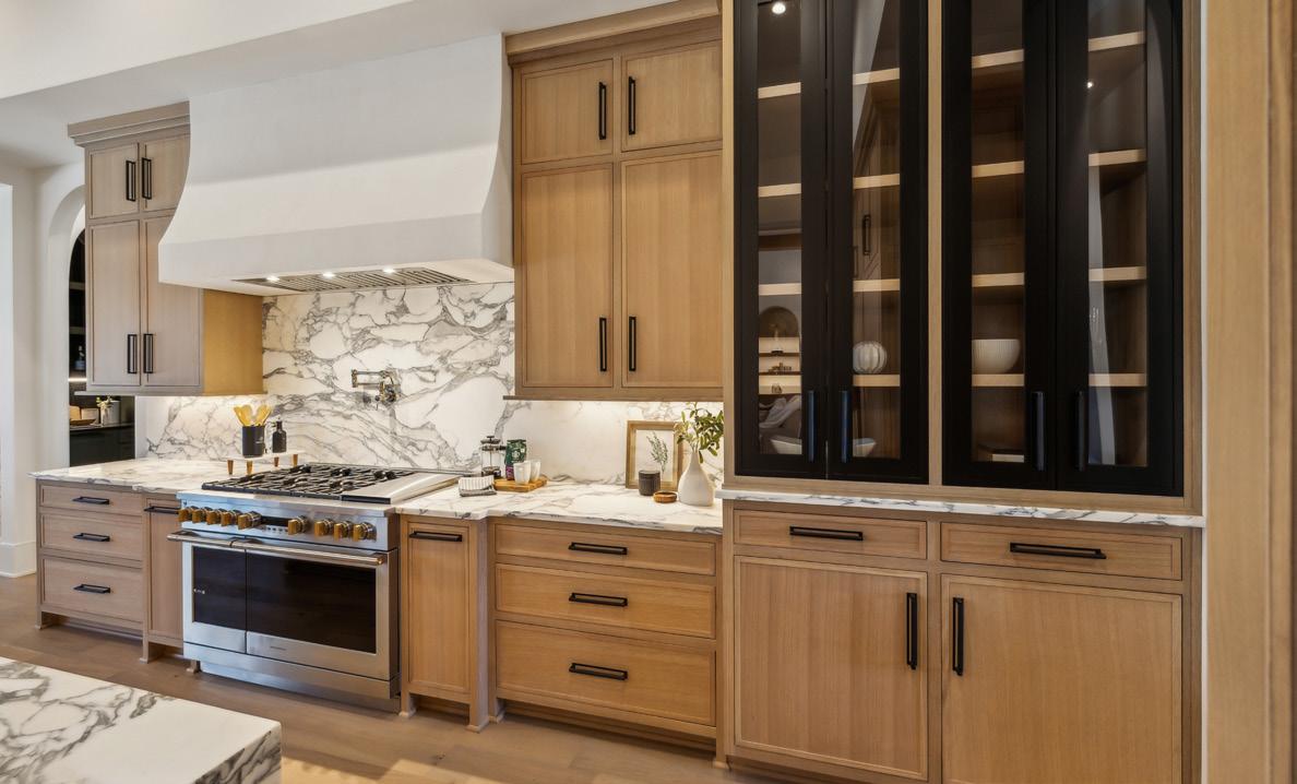 Just steps away, the adjacent Butler’s Pantry seamlessly blends function with high-end design. White oak cabinetry is elevated by bold black glass-front uppers, while a textured stone accent wall introduces an element of rustic charm. Polished quartz countertops and a matching backsplash reflect understated luxury, complemented by under-cabinet lighting and a black custom wine rack—each detail thoughtfully curated for both beauty and entertaining ease.