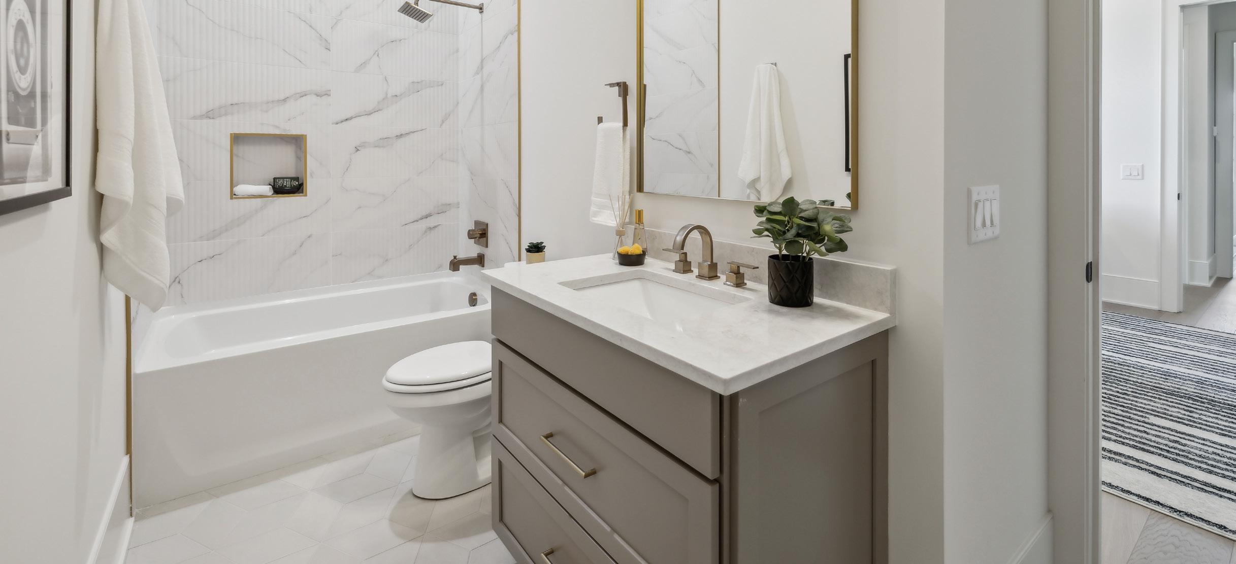 The Powder Room exudes sophistication, featuring a stunning floating vanity crafted from rich black quartz that offers a bold yet elegant statement. Gleaming gold wall-mounted fixtures and sconce lighting add a touch of opulence, perfectly complementing the vanity’s sleek lines.