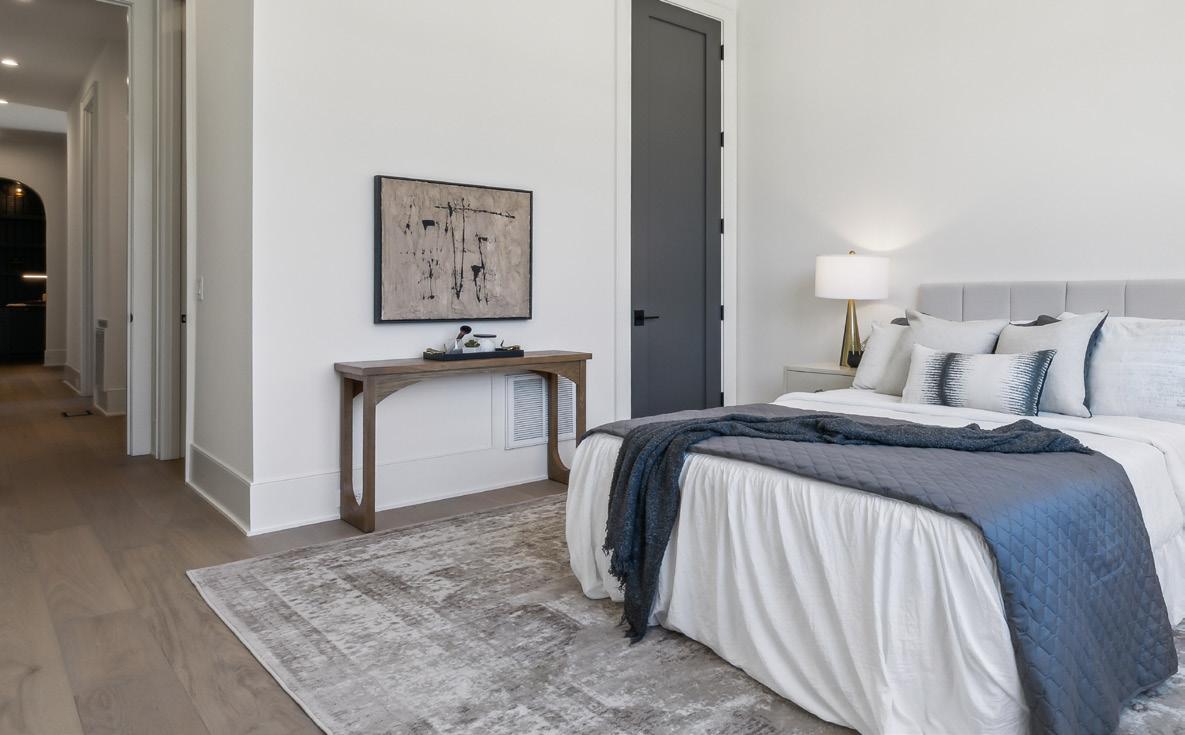 Bedroom #5 offers a serene and stylish retreat, featuring rich hardwood flooring, a walk-in closet with custom wood shelving, and a round light fixtures that create a warm ambiance. The ensuite bathroom is thoughtfully appointed with a quartz vanity, trimmings of antique gold, and a tub/shower combination. The shower is adorned with reed-patterned marble-style tile surround, adding a touch of texture and elegance to the space.