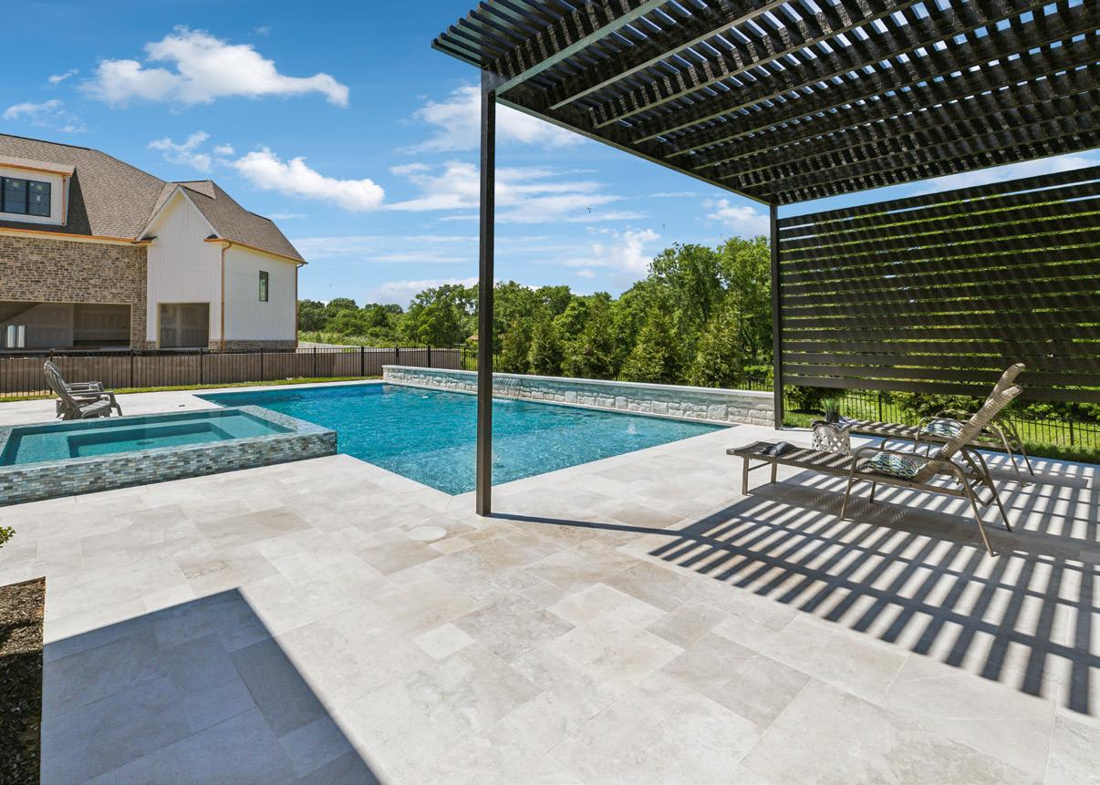 The covered porch serves as an incredible outdoor retreat, featuring a built-in outdoor kitchen—perfect for entertaining. Sliding doors from the family room lead into a remote controlled screened porch that opens to the backyard oasis. Here, you’ll find a sparkling pool and spa surrounded by lush landscaping, creating a serene and private setting. A built-in pergola adds additional shaded seating, making this backyard the ultimate space for relaxation and gatherings.