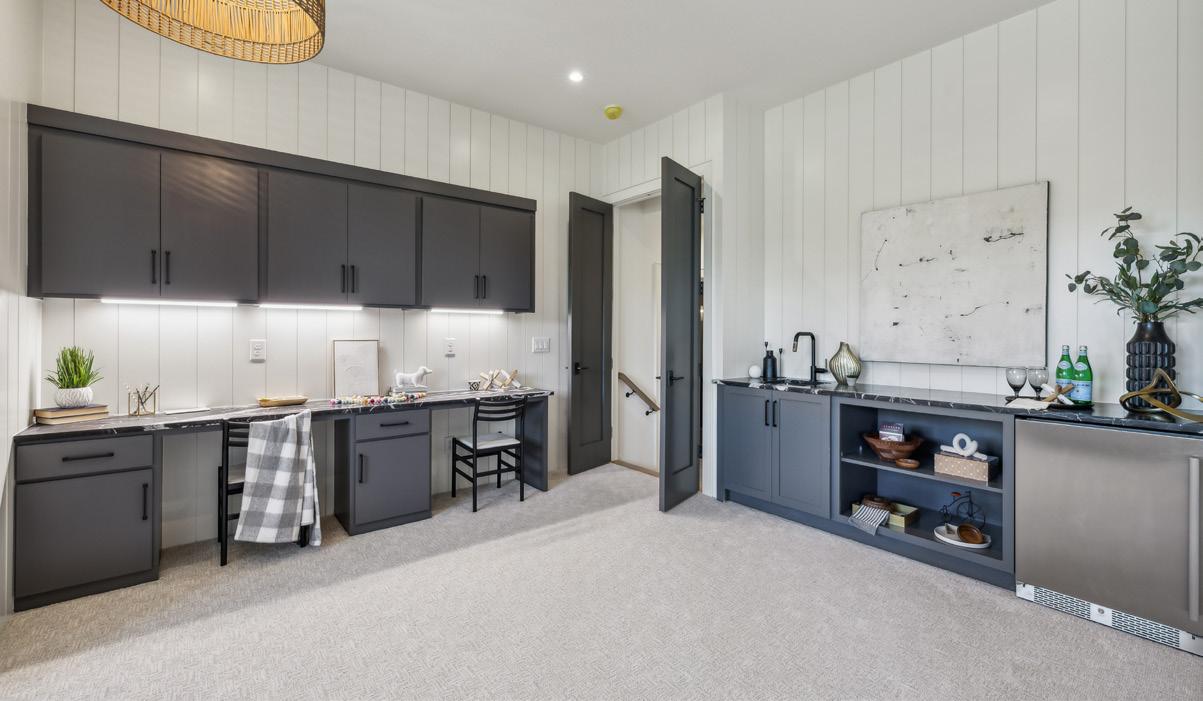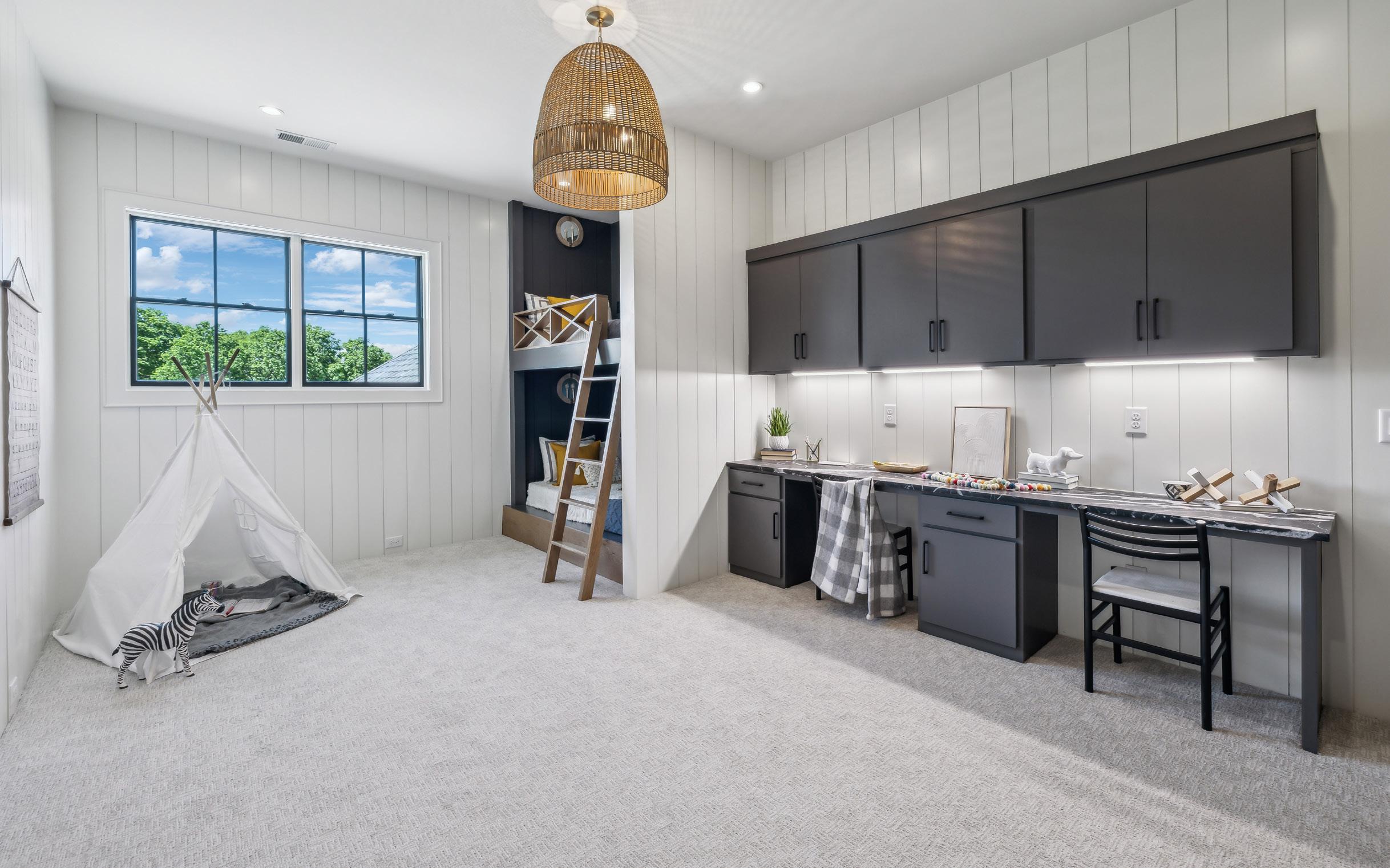 Ascend into a secluded retreat thoughtfully designed to blend comfort and functionality. This space features built-in bunk beds and two stylish desk areas with cabinetry adorned with under cabinet lighting and vertical shiplap wall detailing. The wetbar is complemented by a granite countertop, accented with a black and gold faucet, and illuminated by a rattan chandelier that adds a touch of charm. The wet bar is also equipped with a beverage refrigerator which enhances the area’s convenience, making it perfect for both relaxation and entertainment.
