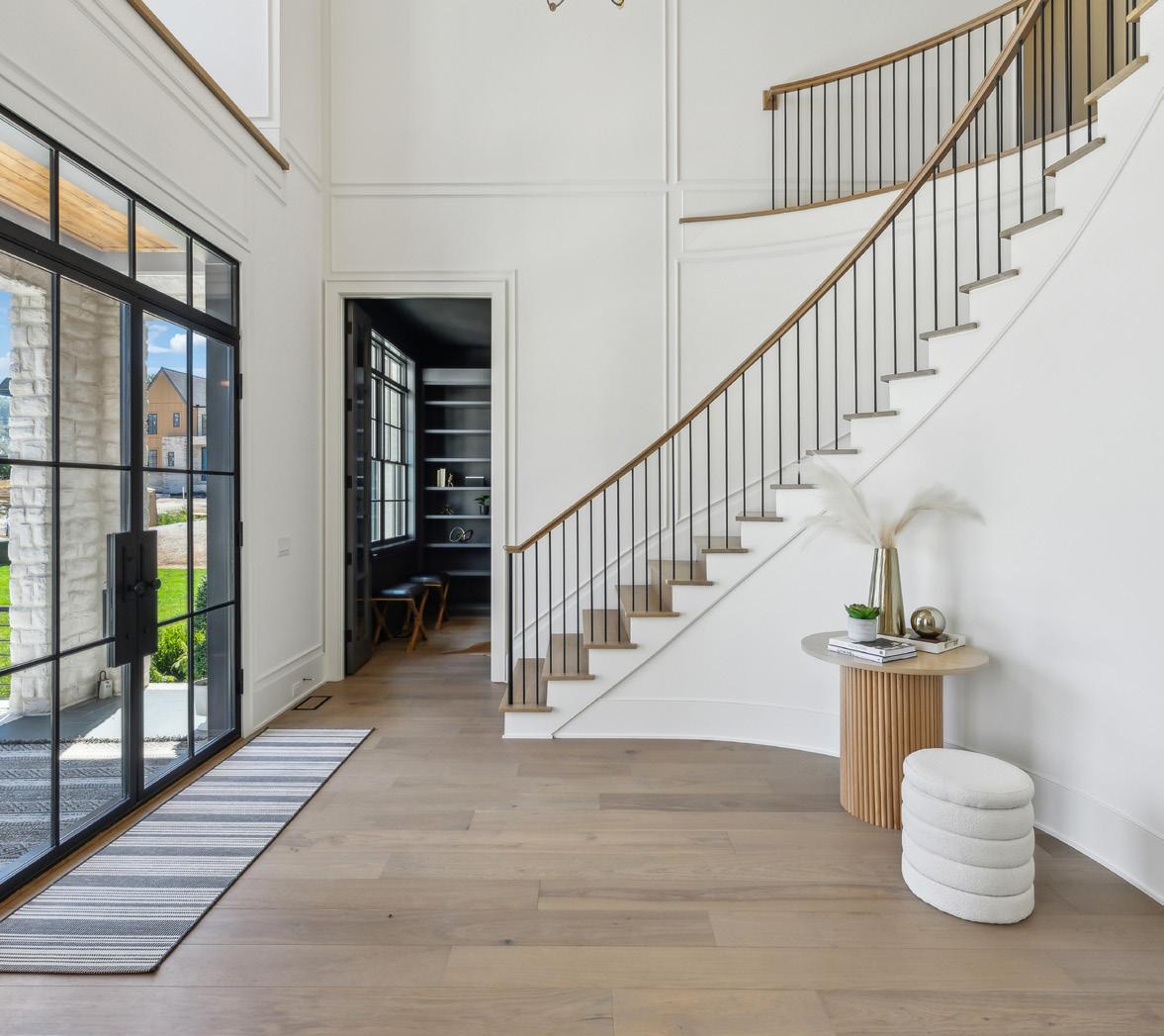 • Foyer – Double 6-Light Iron Doors, Curved Staircase with Iron Rails, Plant Ledge and Wainscot Detail