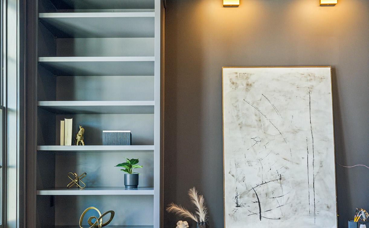 • Study – Painted French Doors, Built-in Shelving with Desk Area, Wood Slat Wall with Hidden Door