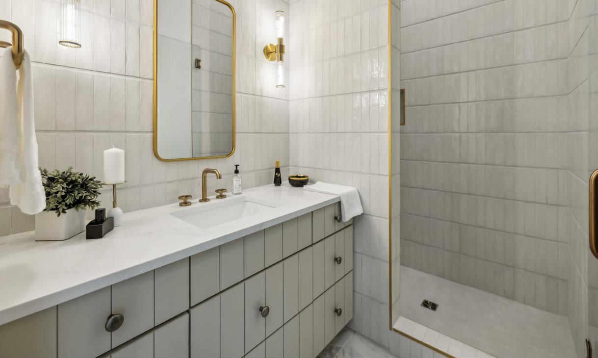 The main-level guest suite offers a tranquil retreat. Overlooking the front yard, the bedroom is illuminated by a chic chandelier and includes a walk-in closet with custom wood shelving. The ensuite bathroom showcases a walk-in shower adorned with vertically laid subway tiles, a design choice that adds height and a modern touch to the space. A quartz countertop vanity offers deep drawers providing ample storage, complemented by antique gold fixtures and sconce lighting that enhance the room’s elegant ambiance.