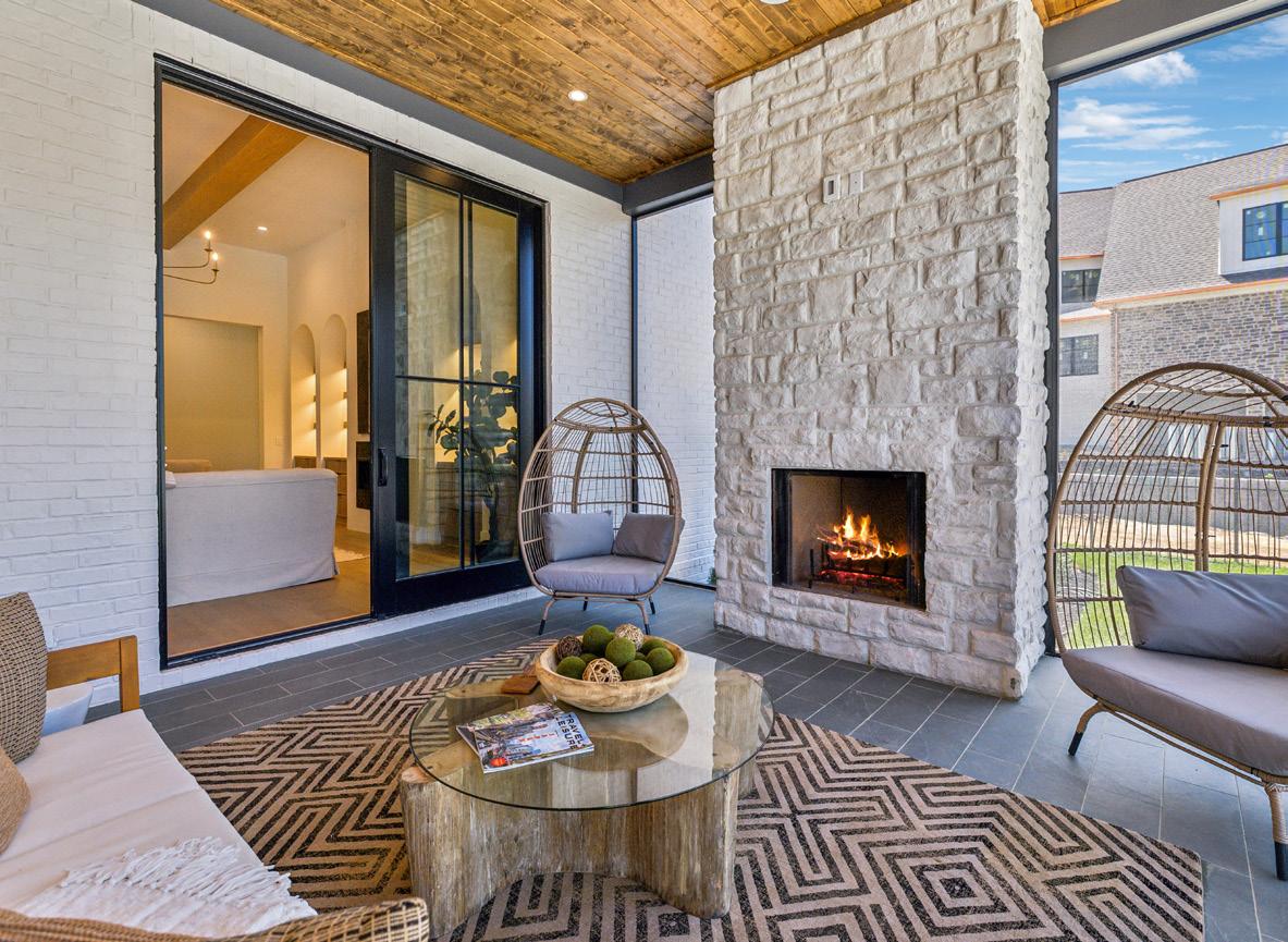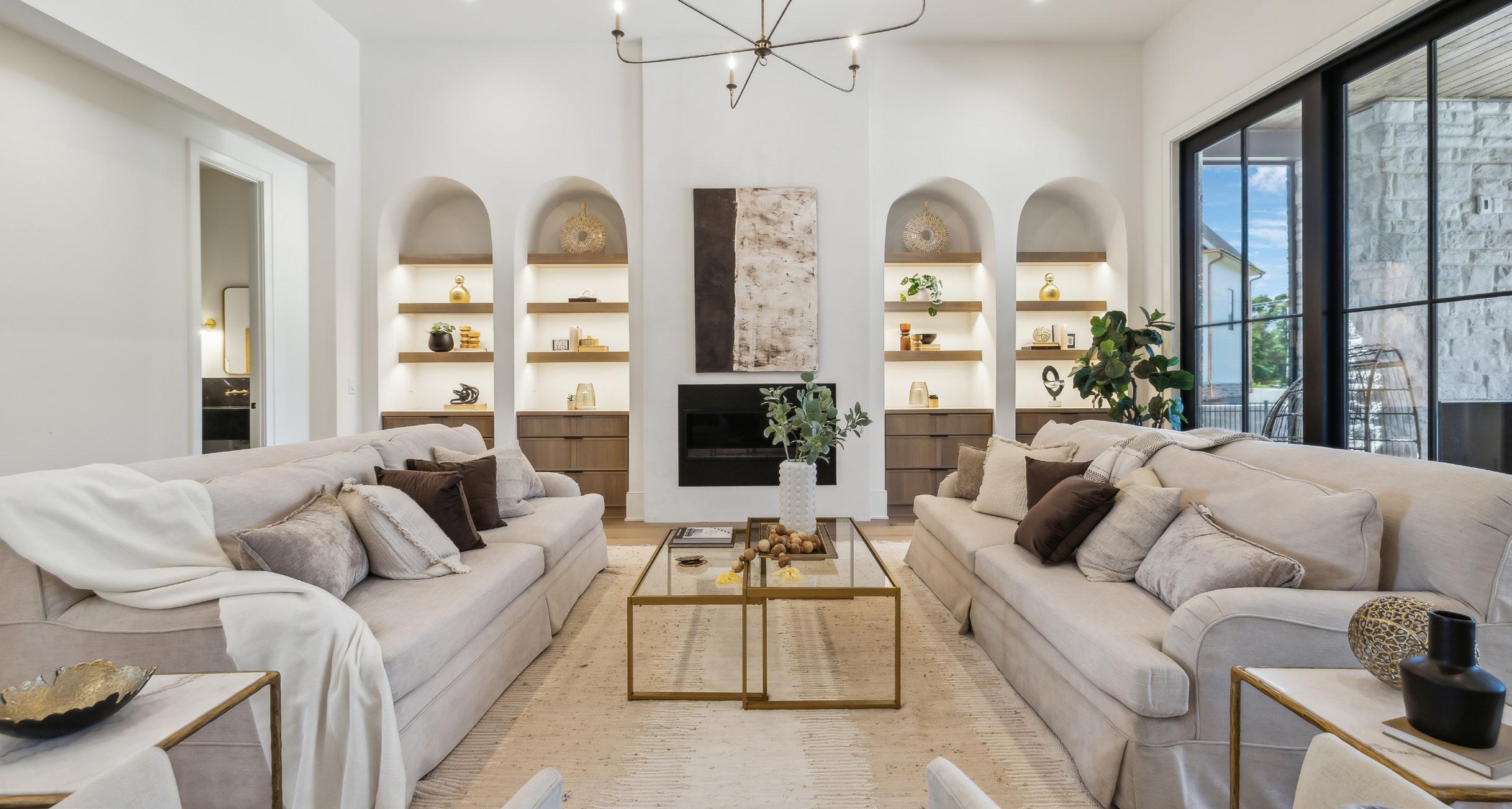 • Family Room – Wood Beam and Shiplap Ceiling, Arched Built-in Shelving with Integrated Lighting, Built-In Speakers, Modern Linear Gas Fireplace with ArcusStone Surround, Gold Candelabra Chandelier and Sliding Glass Doors to the Screened in Porch