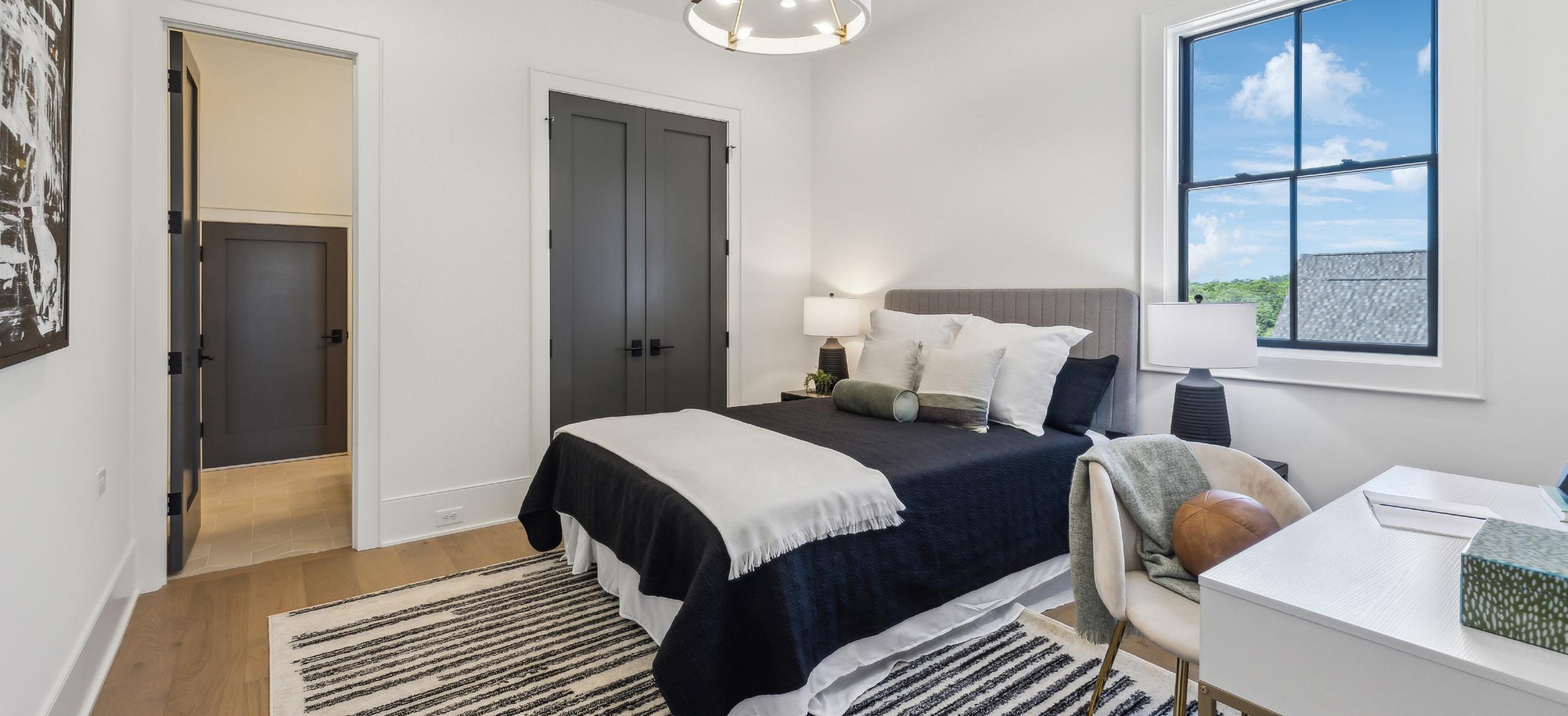 Bedroom #4, located adjacent to the bonus room, offers a serene retreat with warm hardwood flooring and a walk-in closet featuring custom wood shelving. The room is bathed in natural light from its view of the front yard. The ensuite bathroom is thoughtfully designed with a walk-in shower accented with vertically laid matte gray subway tiles, complemented by sleek black fixtures. A honed granite countertop adds a touch of sophistication, while gray tile flooring completes the modern aesthetic.