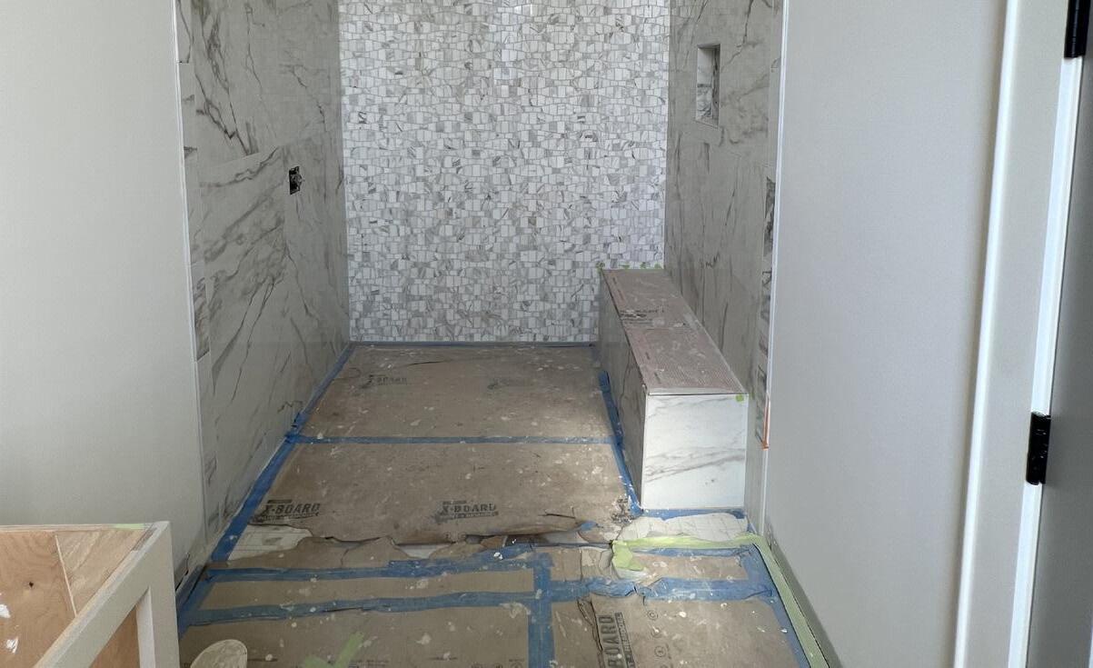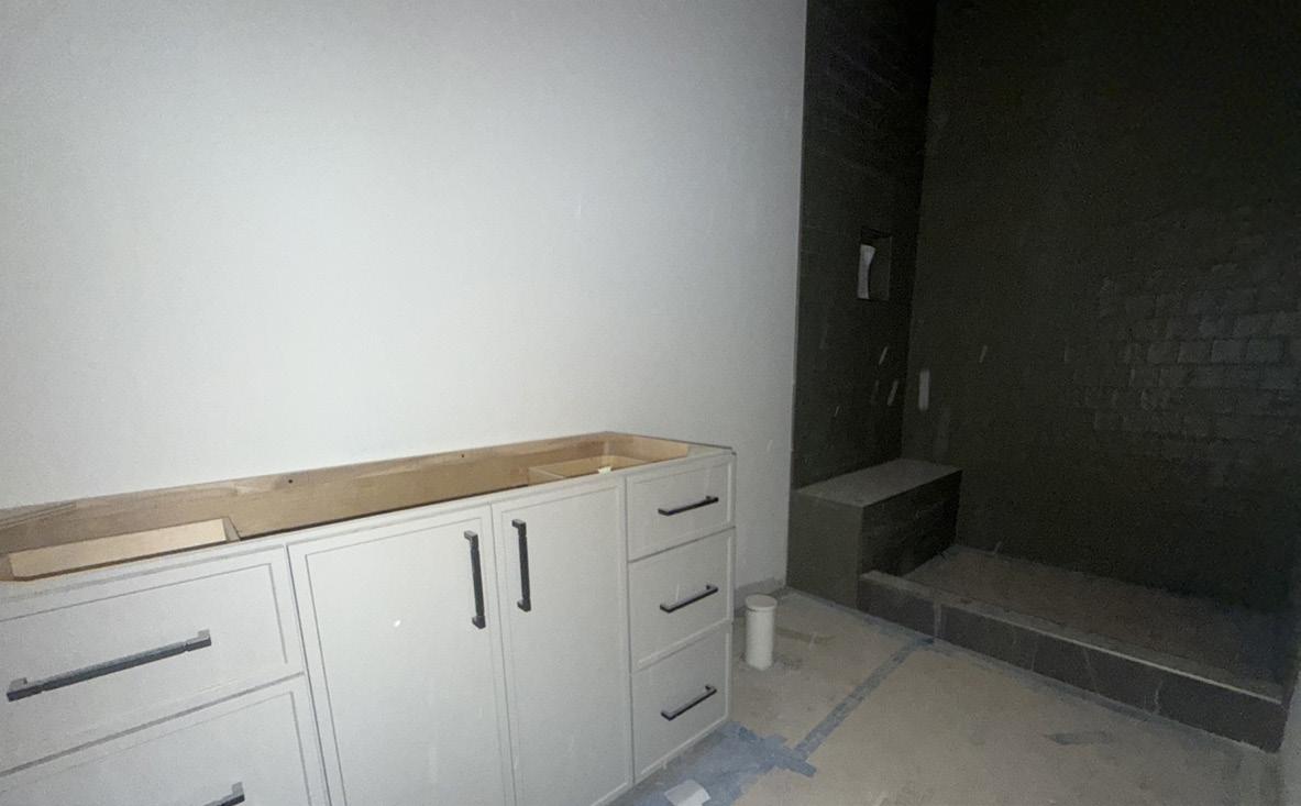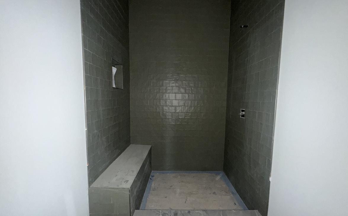 This serene bedroom features a wall of triple windows washing the room in sunlight and overlooking the backyard. A striking black chandelier with marble-inspired detailing adds sophistication, while a spacious walk-in closet with built-in shelving offers ample storage. The en suite bathroom is elegantly appointed with a light gray vanity and a shower tiled to the ceiling in matte tile, complete with a bench and a recessed shampoo niche for both style and functionality.