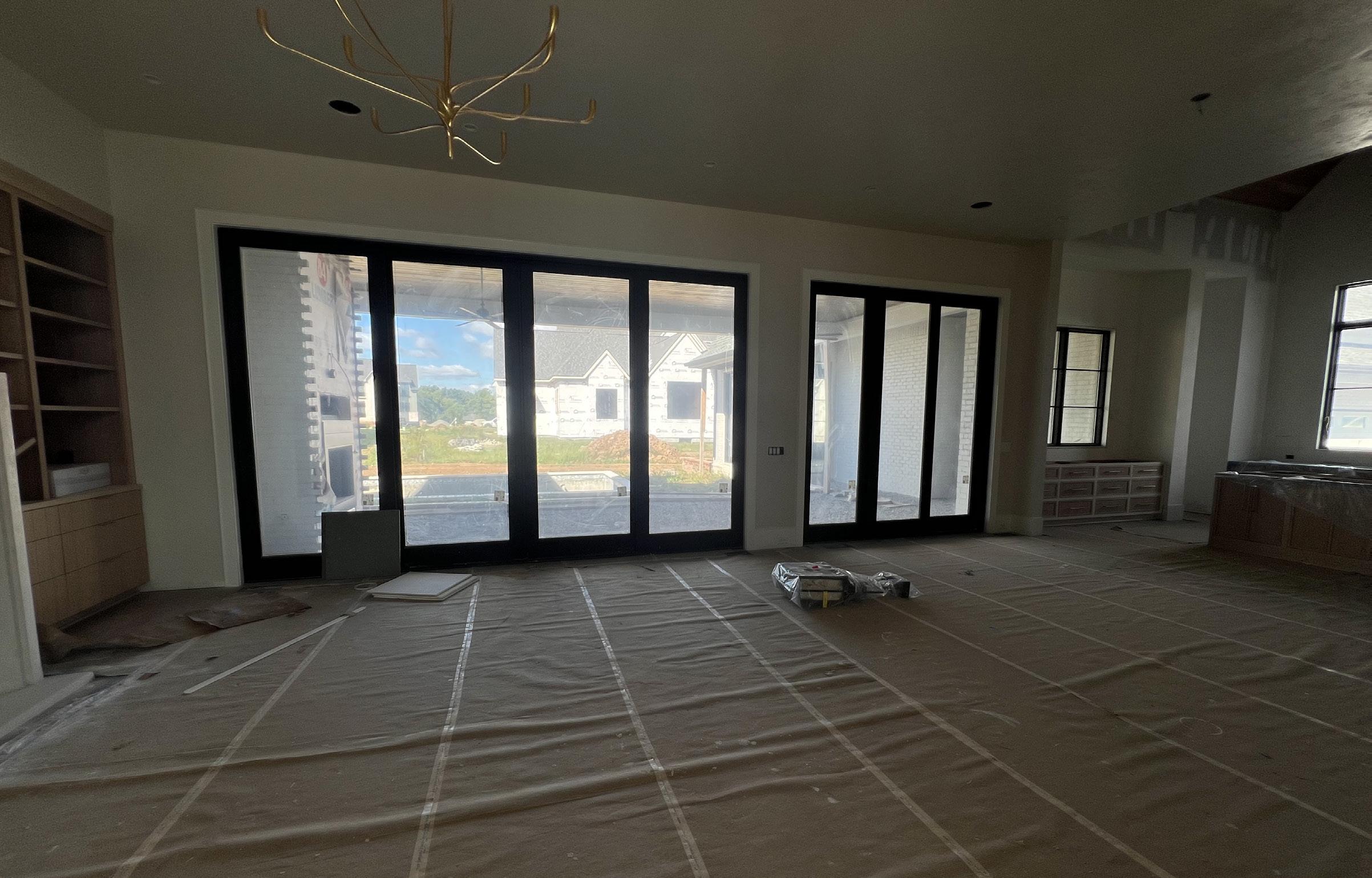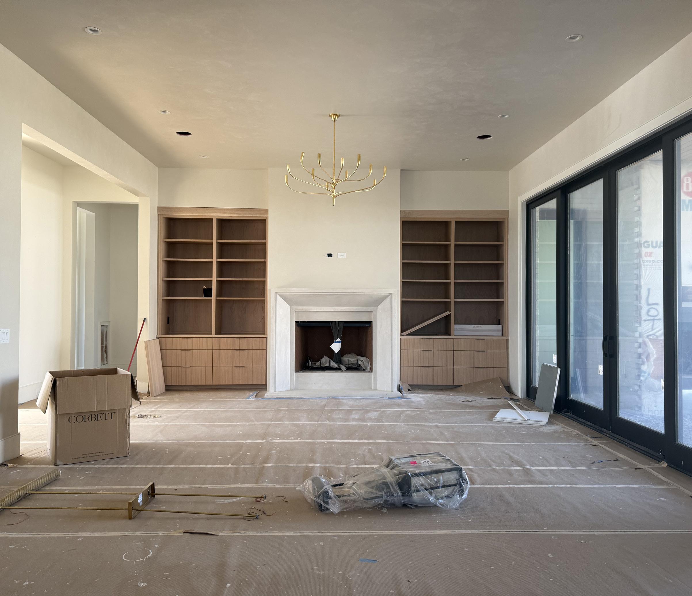 • Elegant family room with ArcusStone-surround fireplace, gold chandelier, built-ins, and retractable sliding doors to the covered porch
