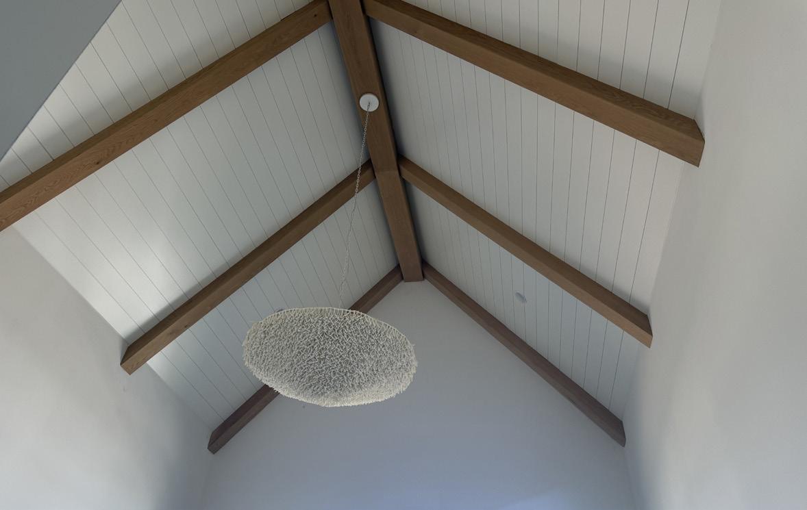 • Primary suite with vaulted 20-ft shiplap ceiling, exposed oak beams, chandelier, and private porch access