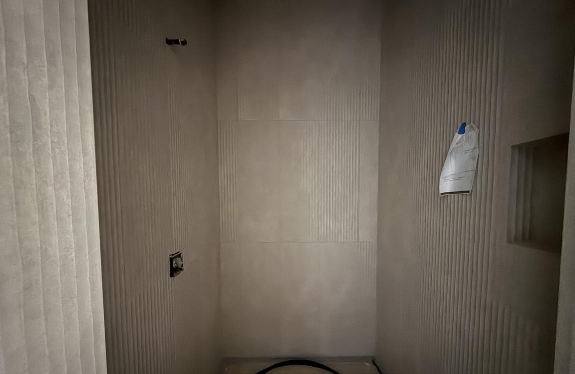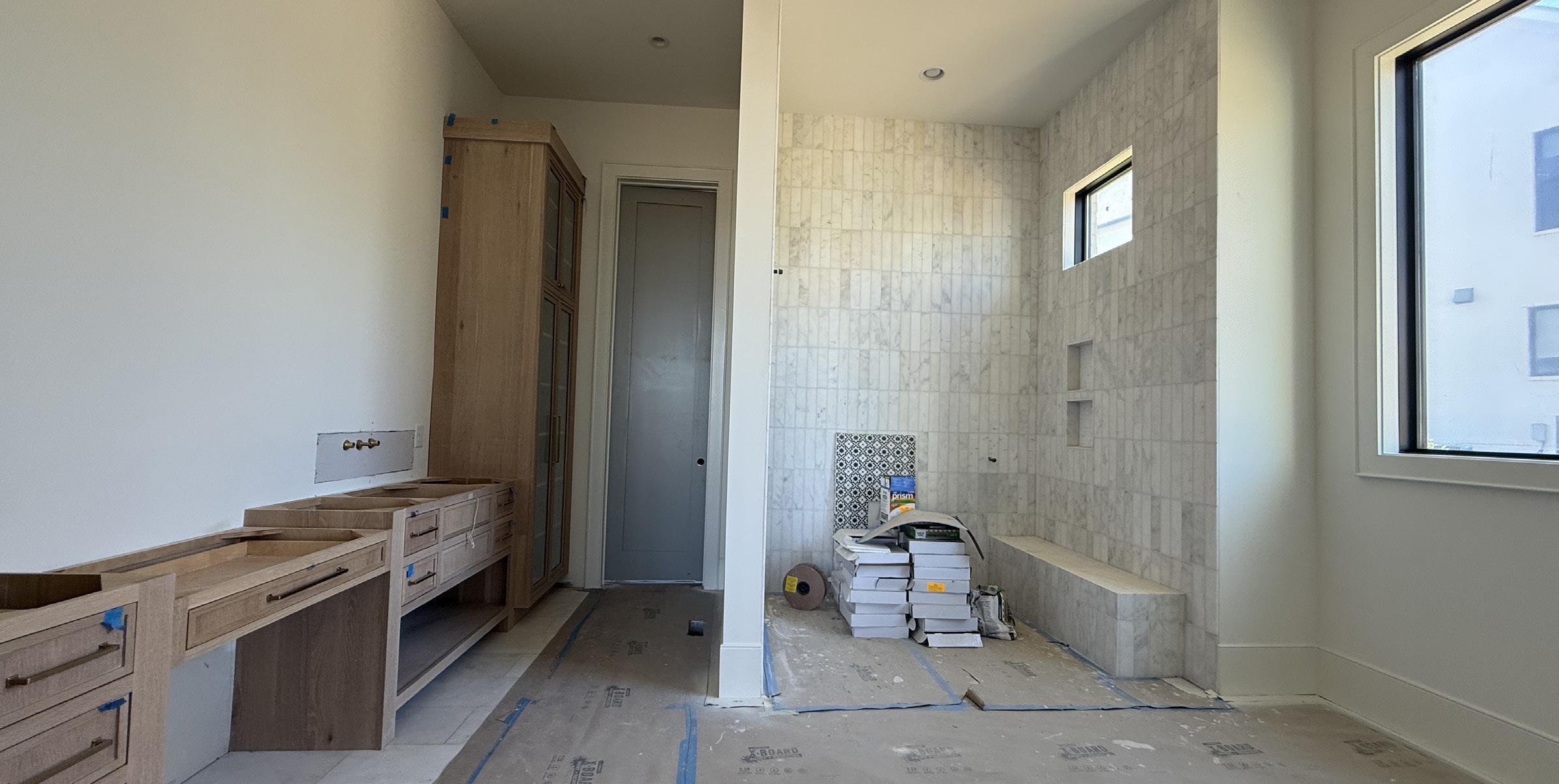 Exquisitely designed, the primary bath features white oak vanities with open shelving and knee space, paired with gold wall-mounted faucets for a sleek, modern aesthetic. A linen tower with glass-front storage adds both elegance and functionality. The spa-inspired shower showcases vertically laid tile, dual showerheads, a built-in bench, and two recessed shampoo niches, all enclosed by frameless glass doors. A freestanding tub offers a serene soaking experience, while a private water closet ensures discretion. Two expansive walk-in closets, complete with built-in shelves and drawers, flank the bath, and large format tile extend throughout, tying the space together with luxury.
