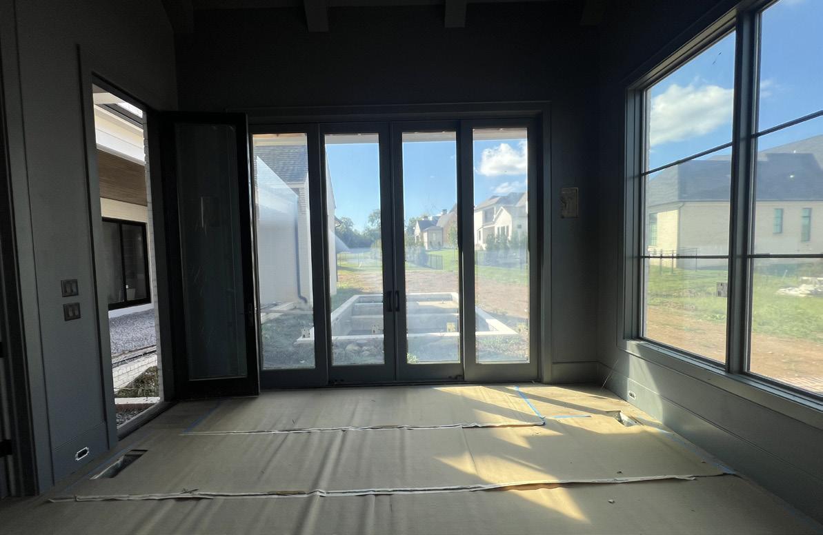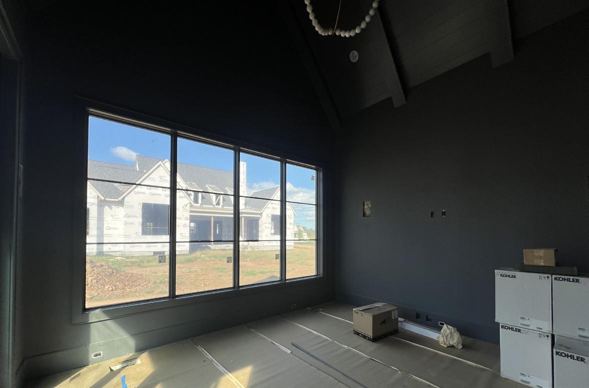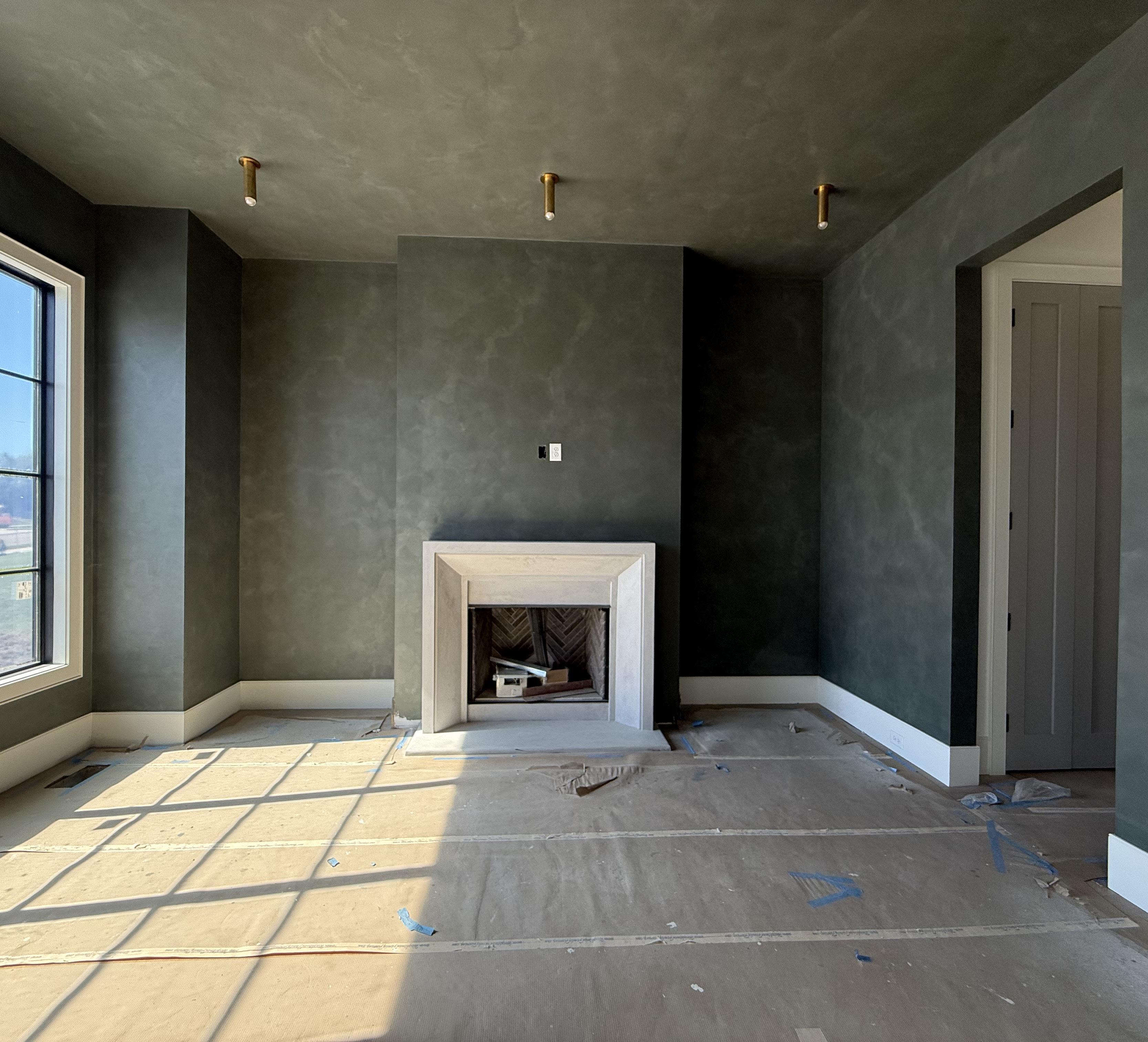 Sophisticated and serene, the study features rich dark plaster walls and ceiling that exude warmth and depth. A striking ArcusStone fireplace anchors the room, offering both character and refinement. Open to the foyer and connected by a hallway to the primary suite, this thoughtfully placed retreat enjoys a wall of windows overlooking the front yard, filling the space with natural light while maintaining an atmosphere of quiet elegance.
