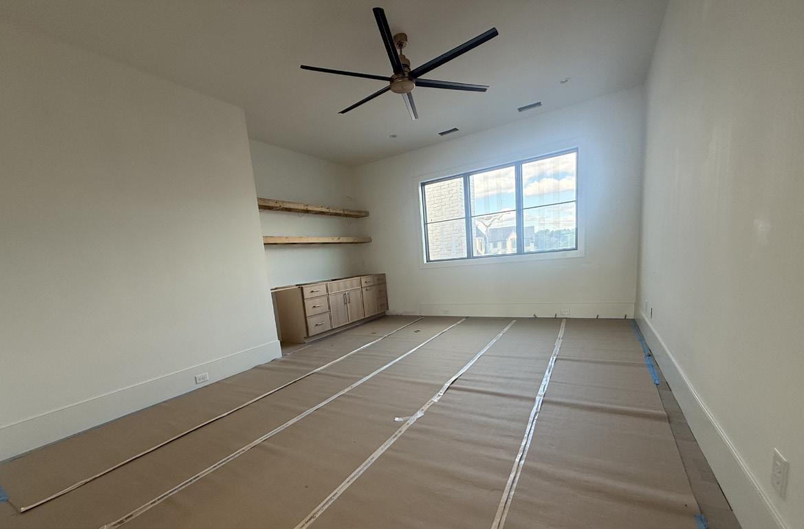 The versatile bonus room features a wet bar with built-in shelving highlighted by accent lighting, perfect for entertaining or casual gatherings. A wall of triple windows overlooks the backyard, maximizing natural light, while a contemporary black-and-gold ceiling fan adds a stylish, modern touch.