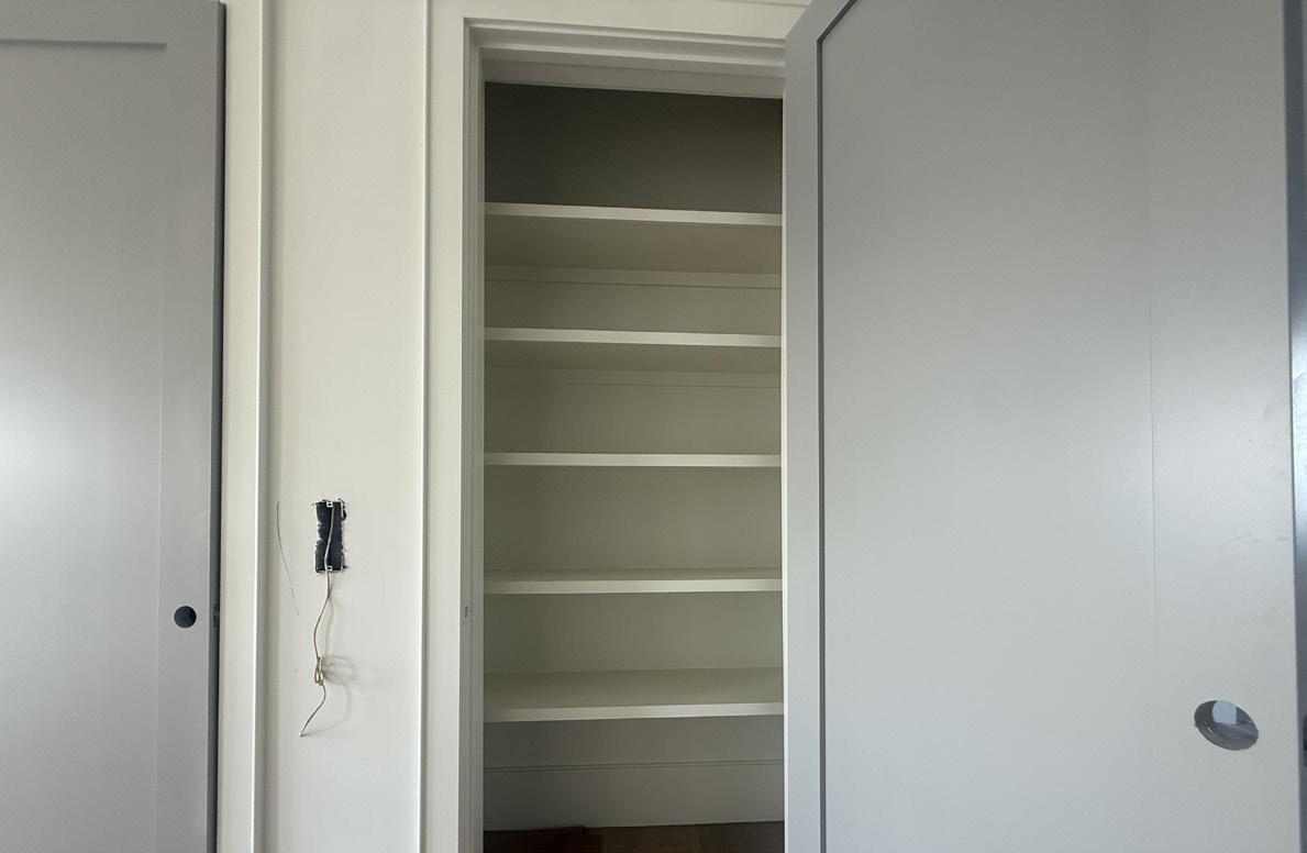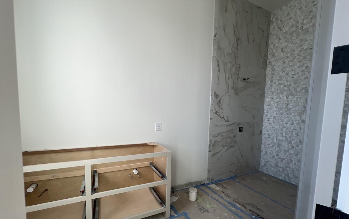 Just off the foyer, the elegant powder room features a contemporary floating sink with wall-mounted faucets flanked by contemporary sconces, creating a sleek and sculptural focal point. The minimalist design offers a sophisticated touch for guests. Nearby, a spacious walk-in closet provides convenient storage and adds to the thoughtful flow of the home’s entryway.