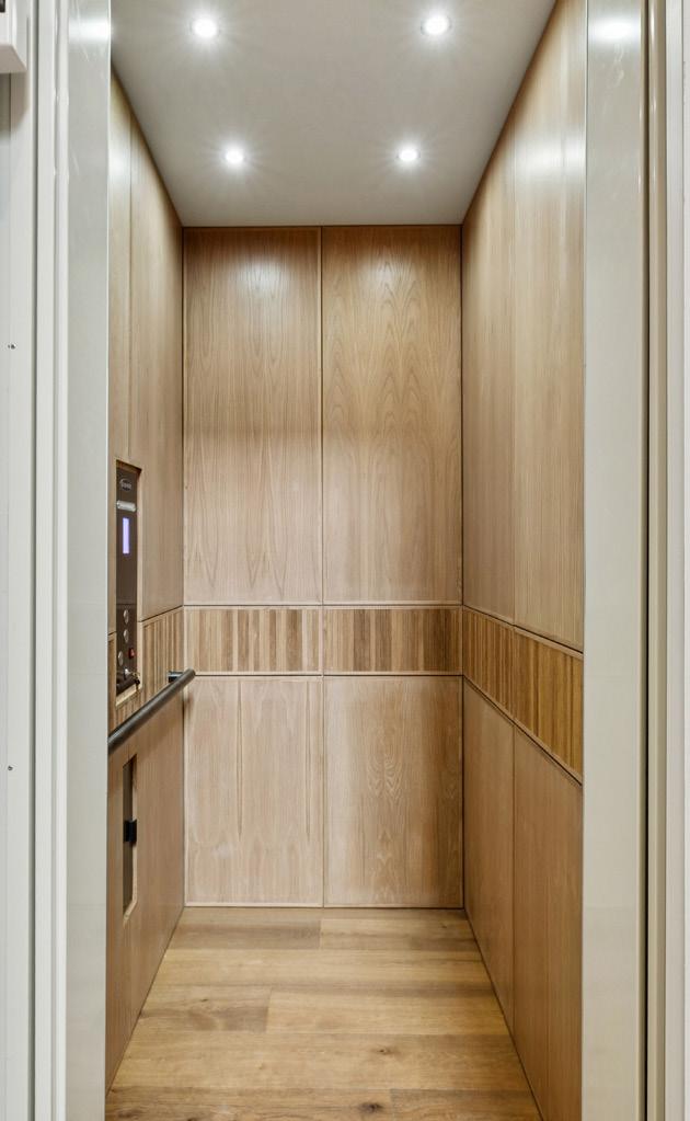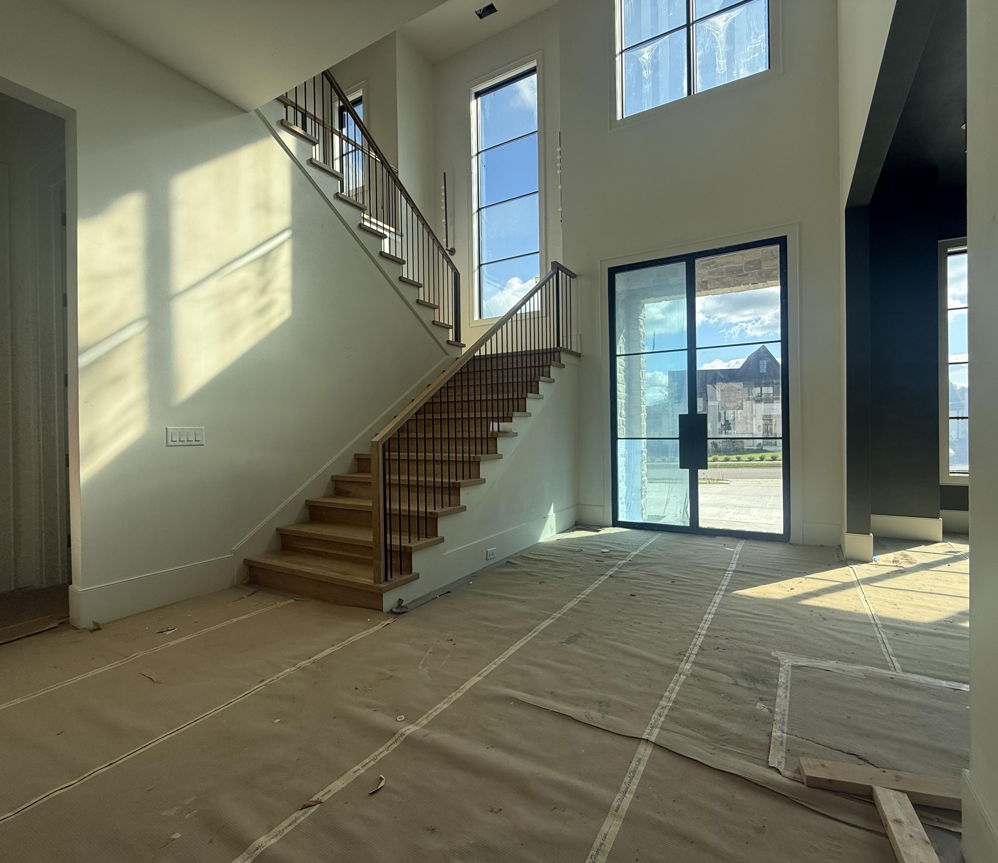 • Grand two-story foyer with double iron and glass doors, open staircase, and elevator access