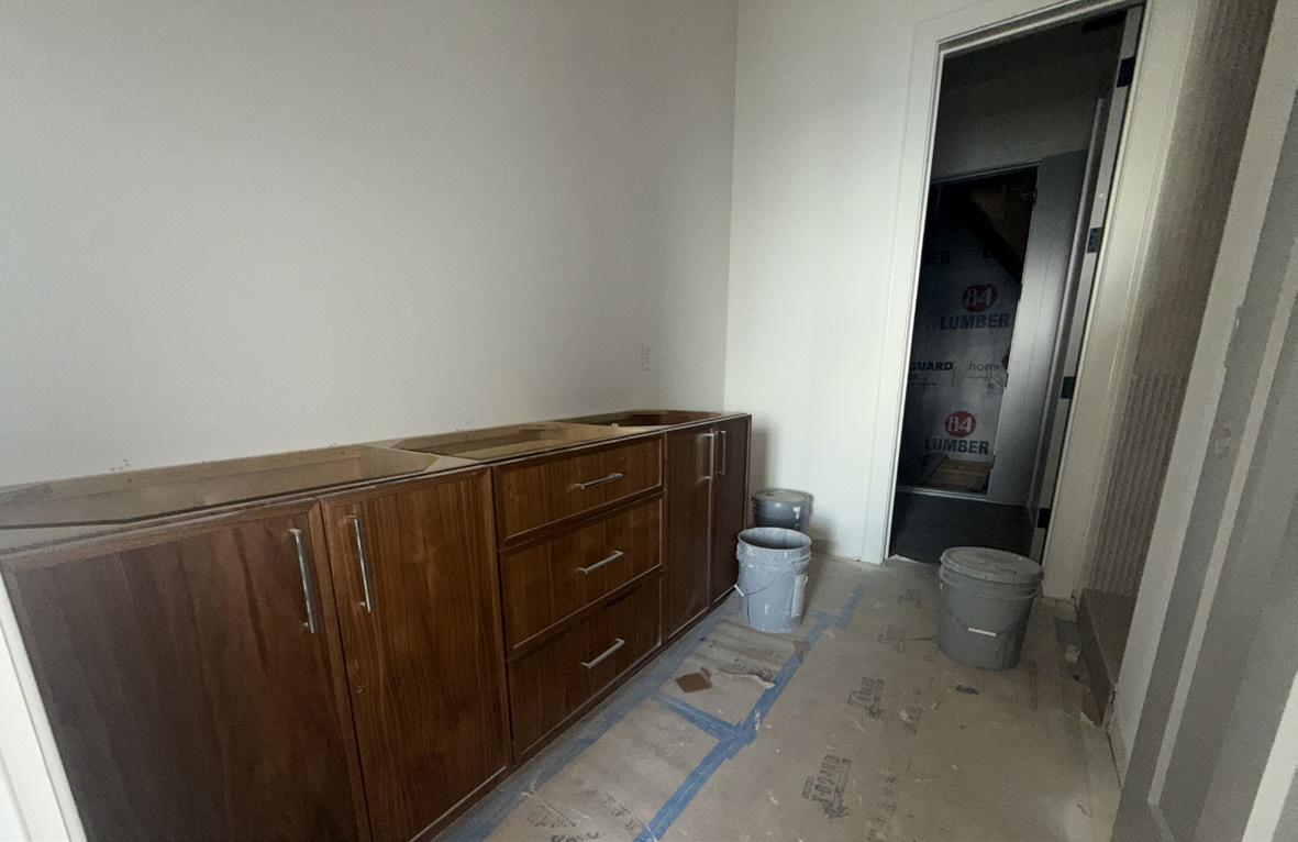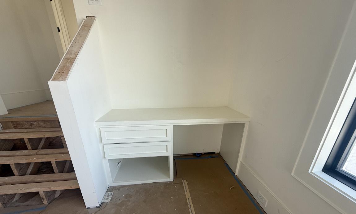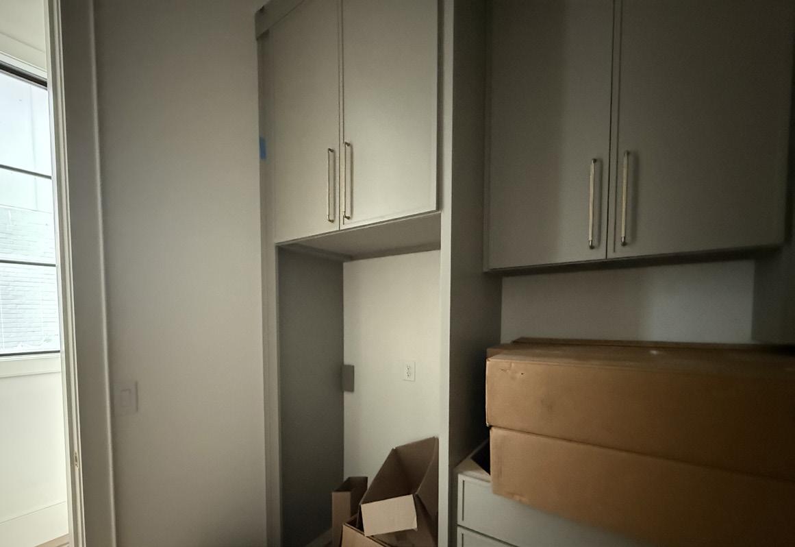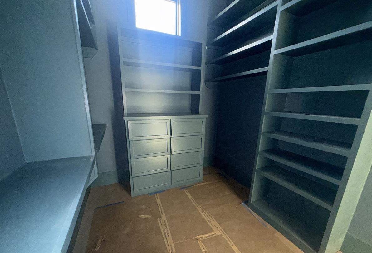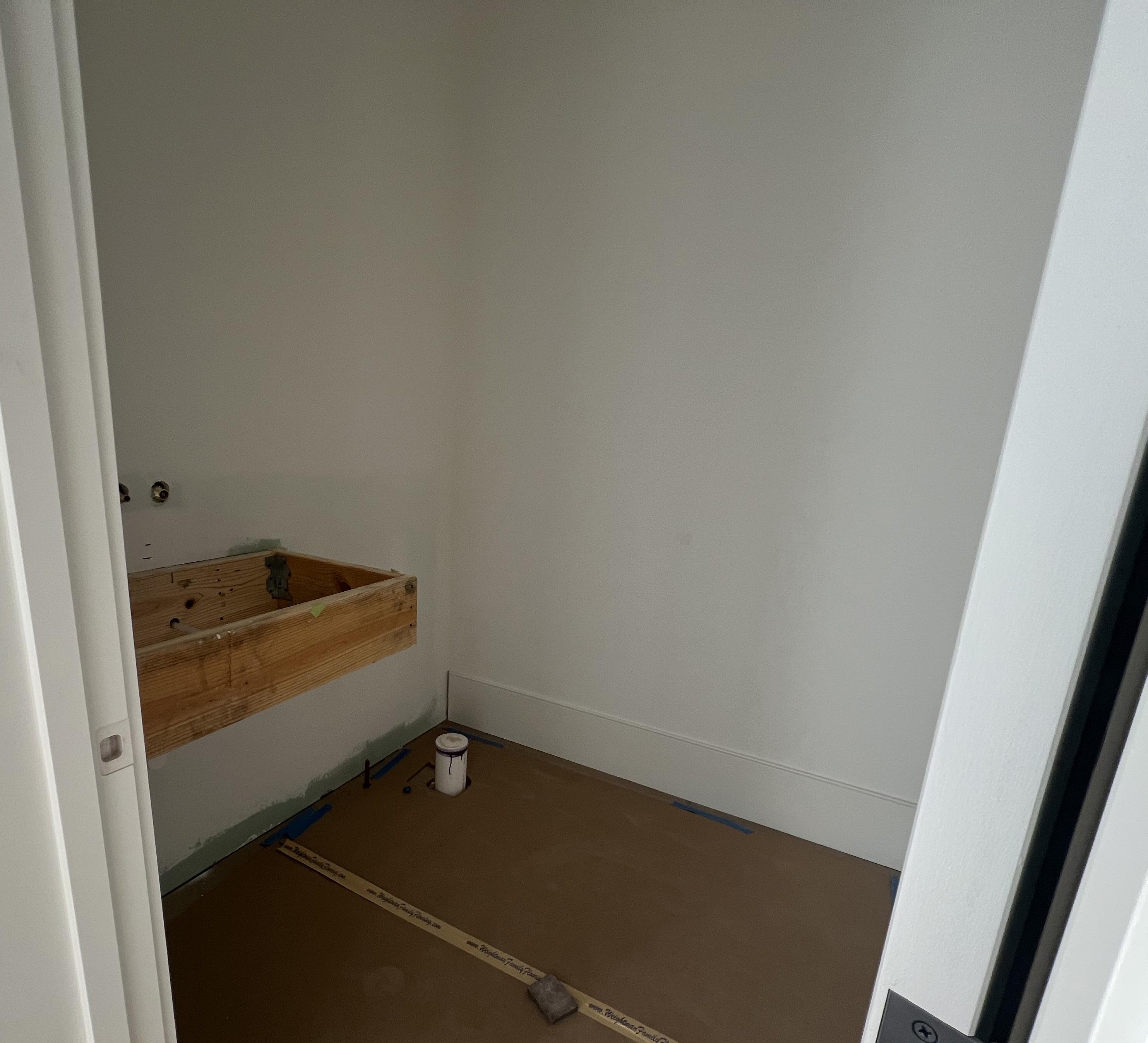 The upstairs laundry mirrors the style and functionality of the main-level laundry in a compact, efficient layout. While it does not include a sink, it features deep storage drawers and ample countertop space, providing a convenient and organized space for everyday laundry tasks.