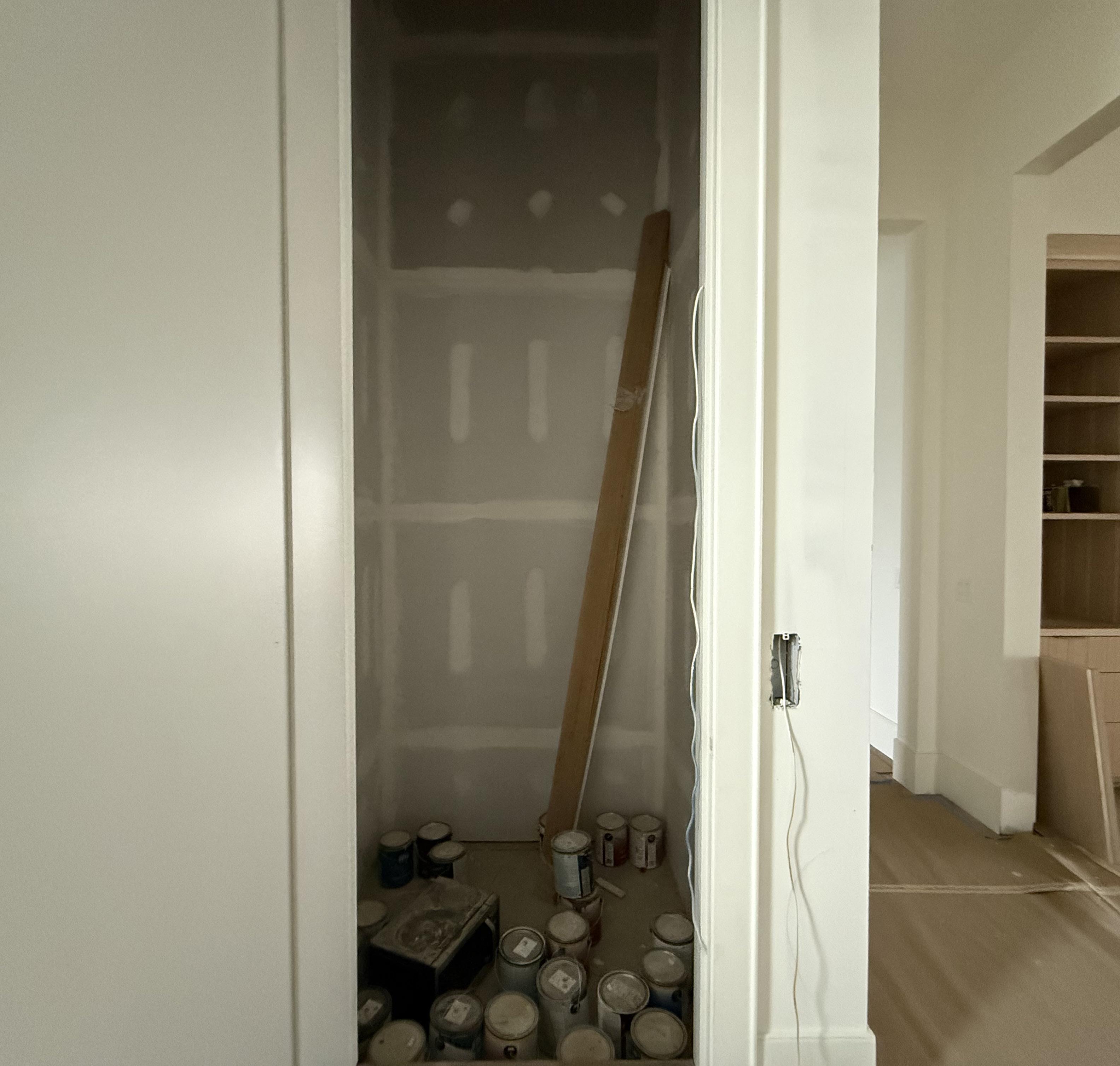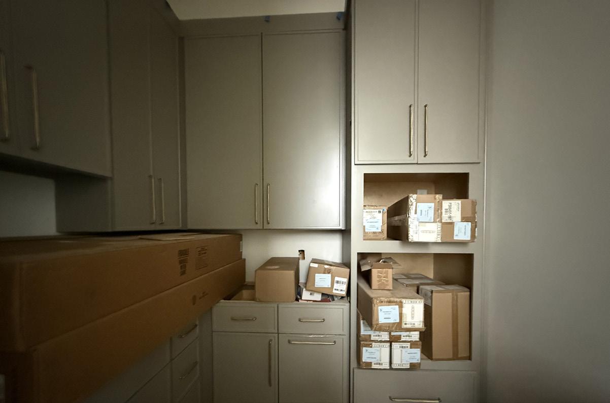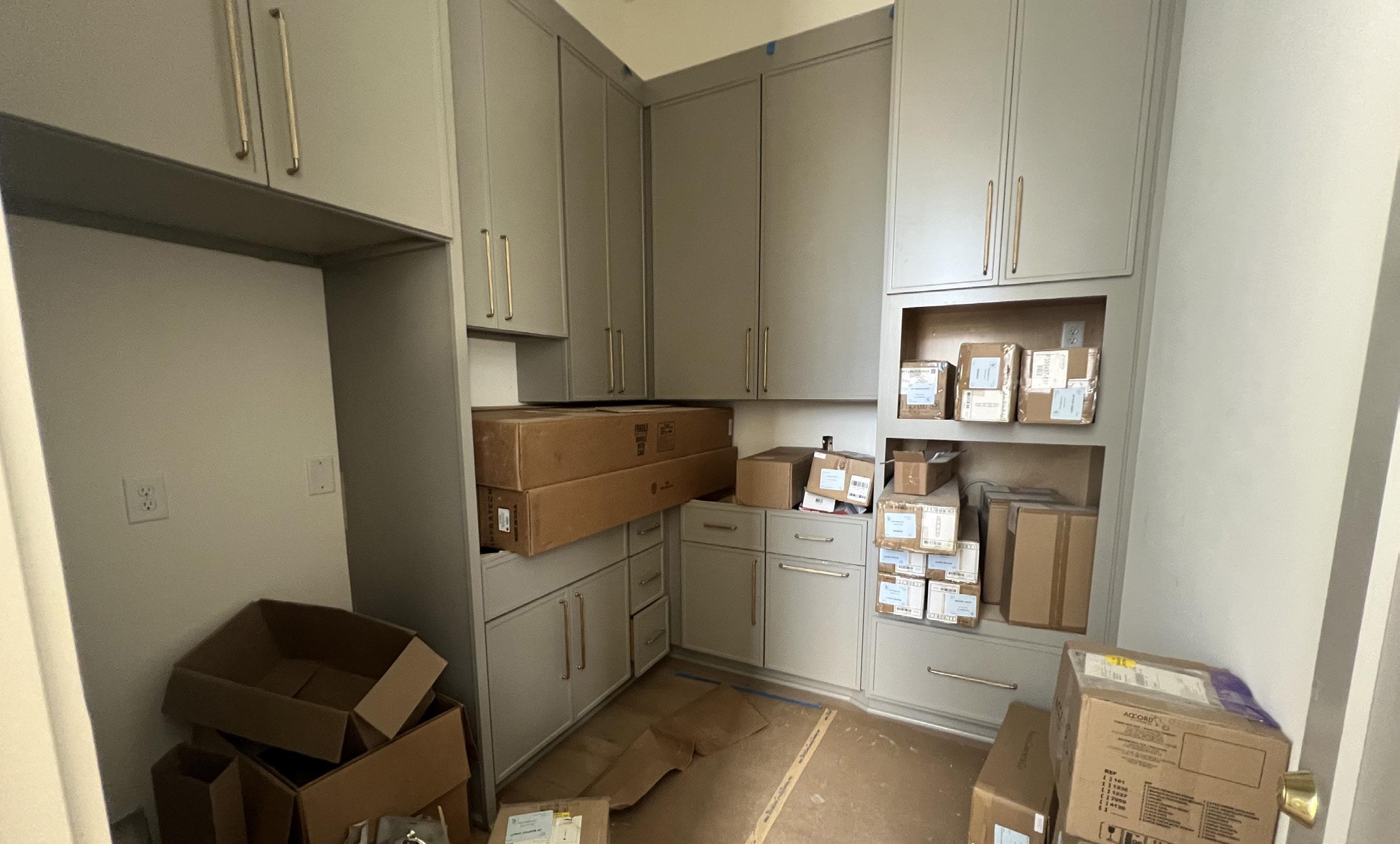 Conveniently located off the foyer entry hallway and just steps from the kitchen, this thoughtfully designed pantry combines style and functionality. Featuring upper and lower cabinetry with soft-close doors and drawers, it includes a built-in microwave and oven combo, a separate refrigerator, and a pull-out trash system. The space is perfectly organized for effortless meal prep and storage, keeping the kitchen streamlined and elegant.