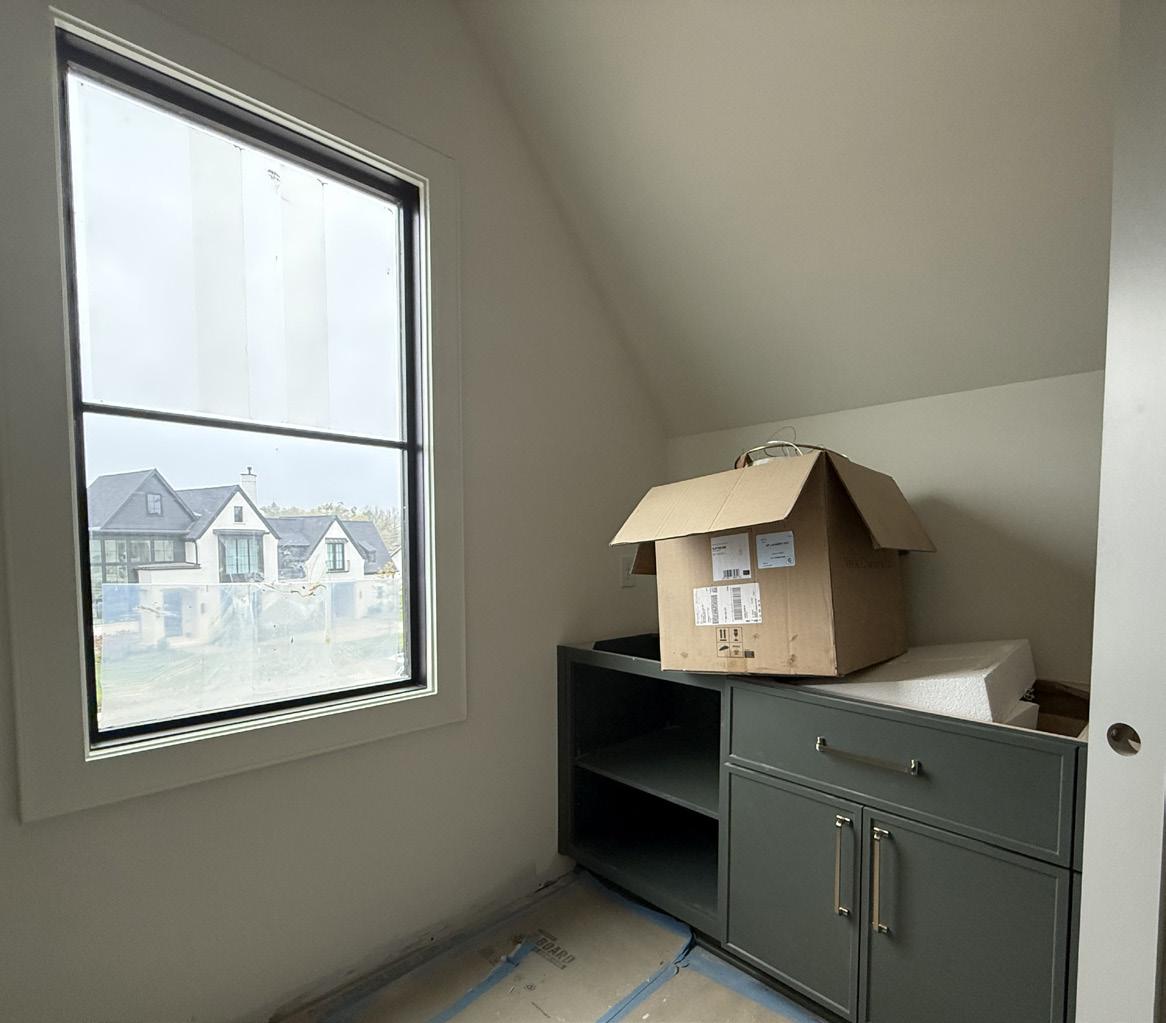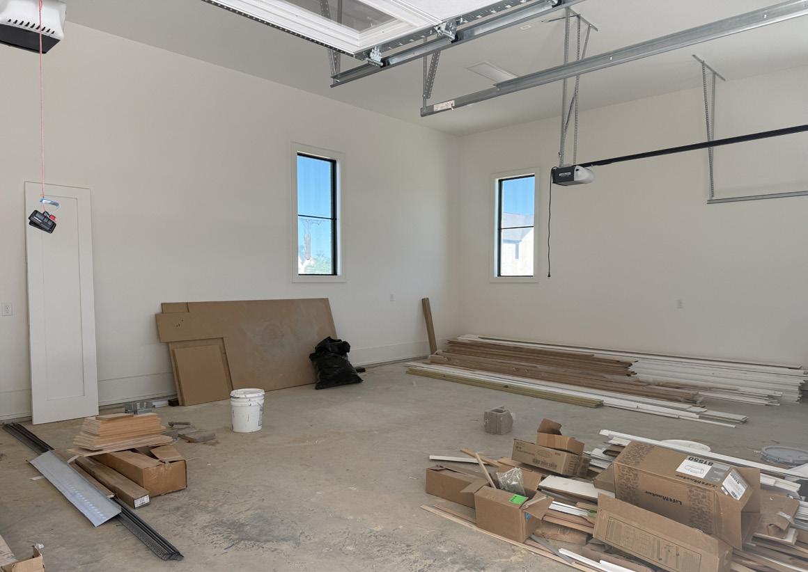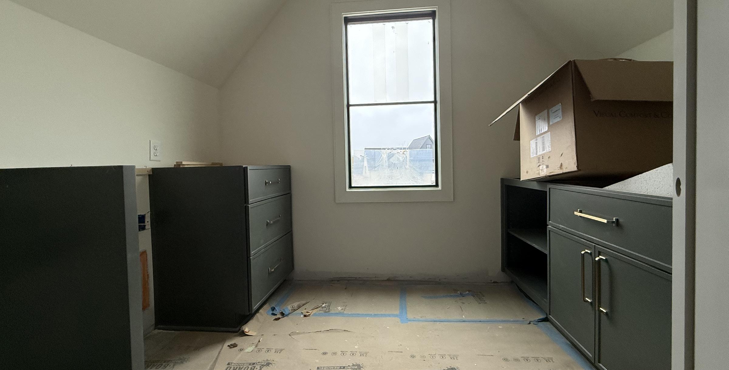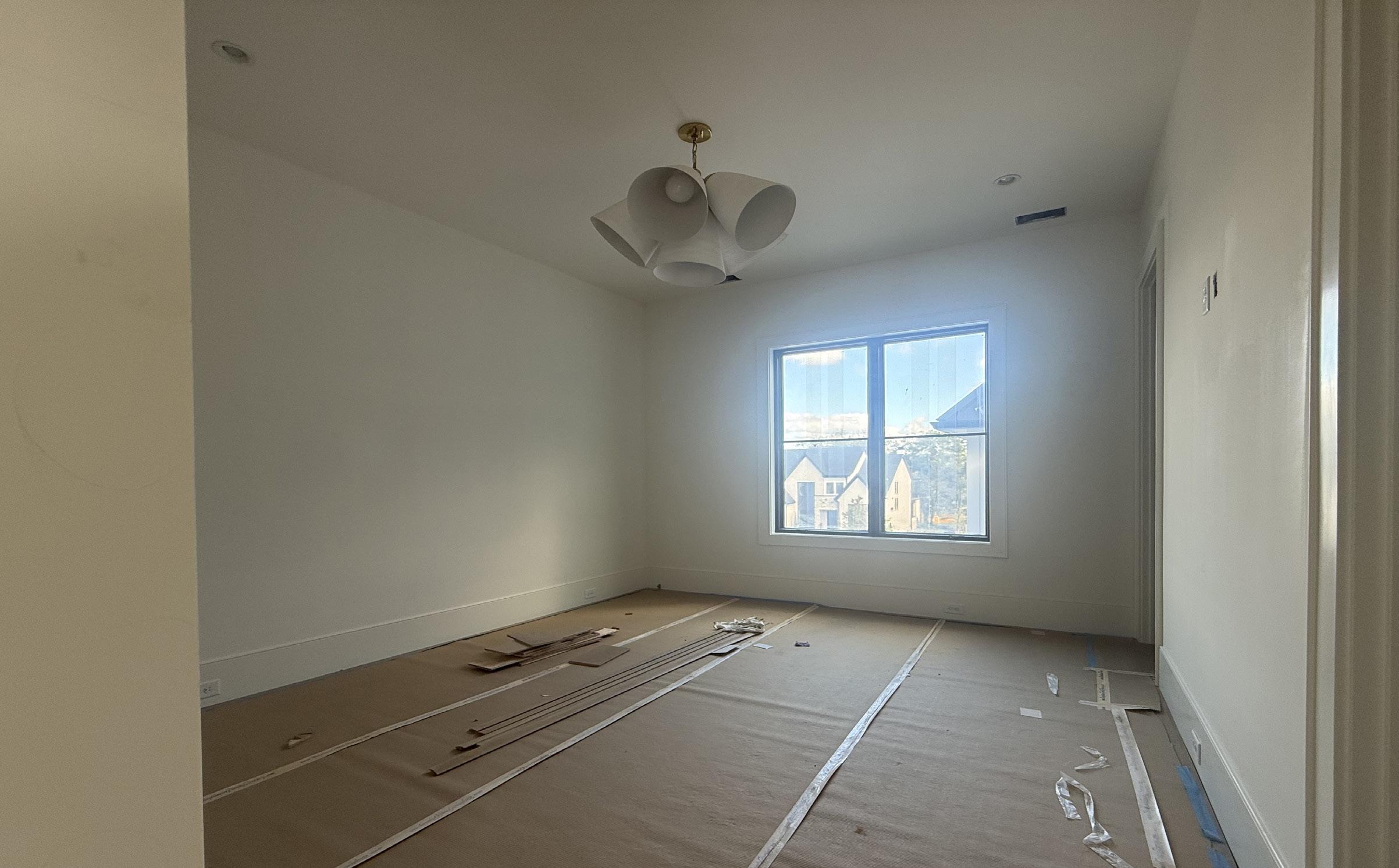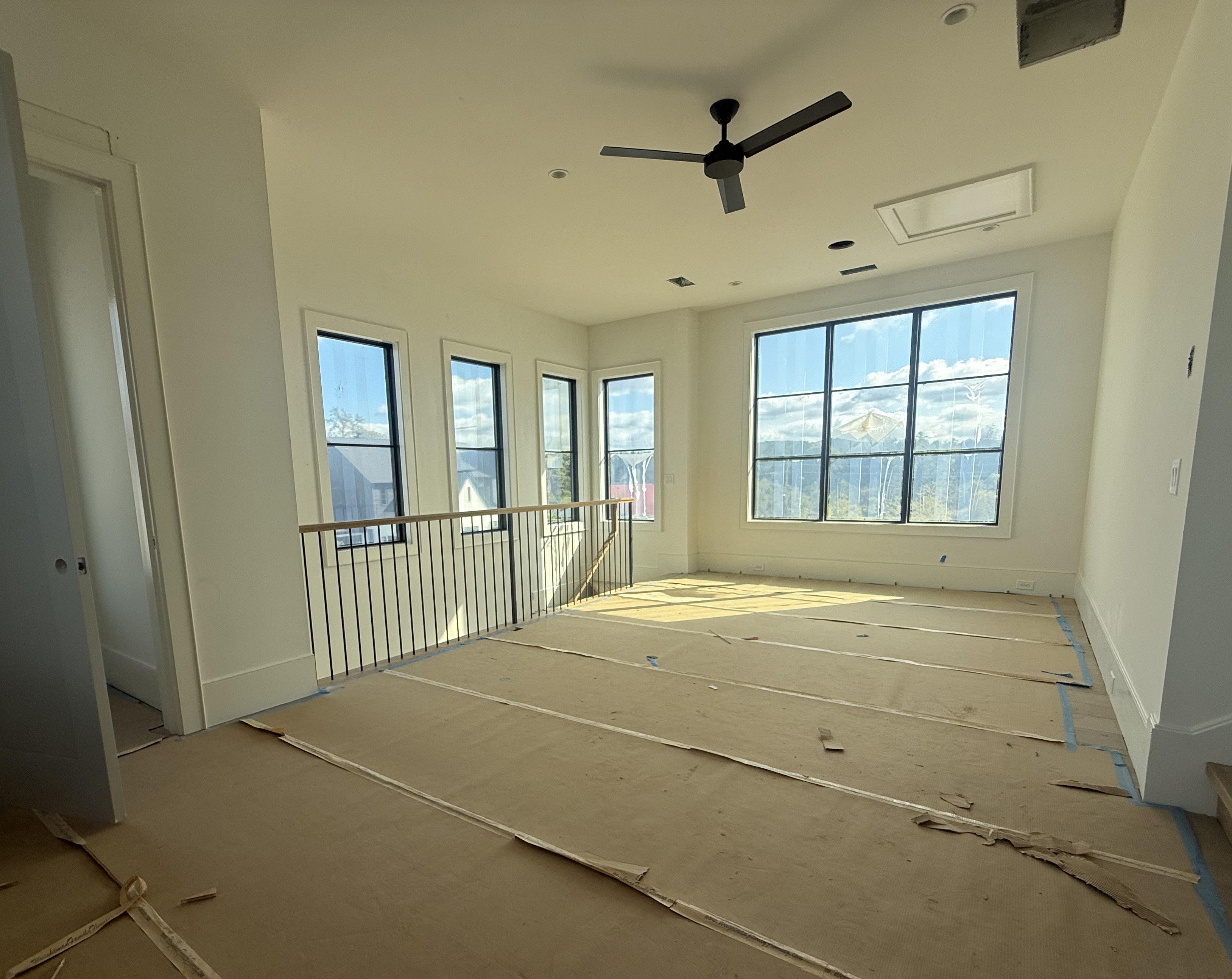 Located above the single-car garage, the exercise room combines form with practical intent. Hardwood floors and an iron stair railing provide durable, gym-ready surfaces with a modern edge, while a built-in storage closet keeps equipment and essentials neatly organized. Three walls of windows provide optimal sunlight exposure throughout the day, and a sleek black ceiling fan adds a contemporary touch while maintaining airflow. A pedestrian door offers direct access to the outdoors via the courtyard, enhancing both convenience and flexibility. With its private entrance and light-filled interior, this space could also function comfortably as a home office or creative studio.